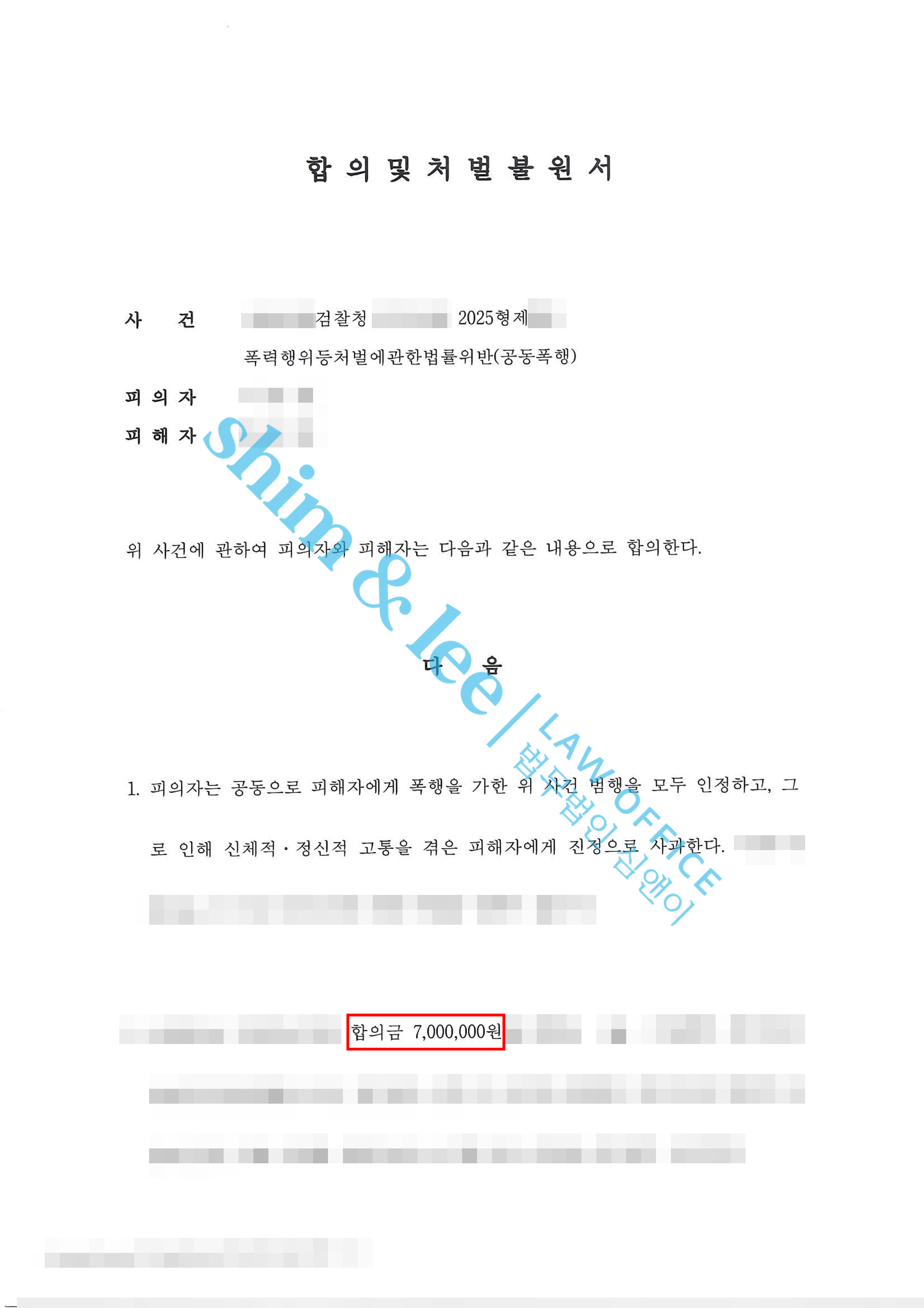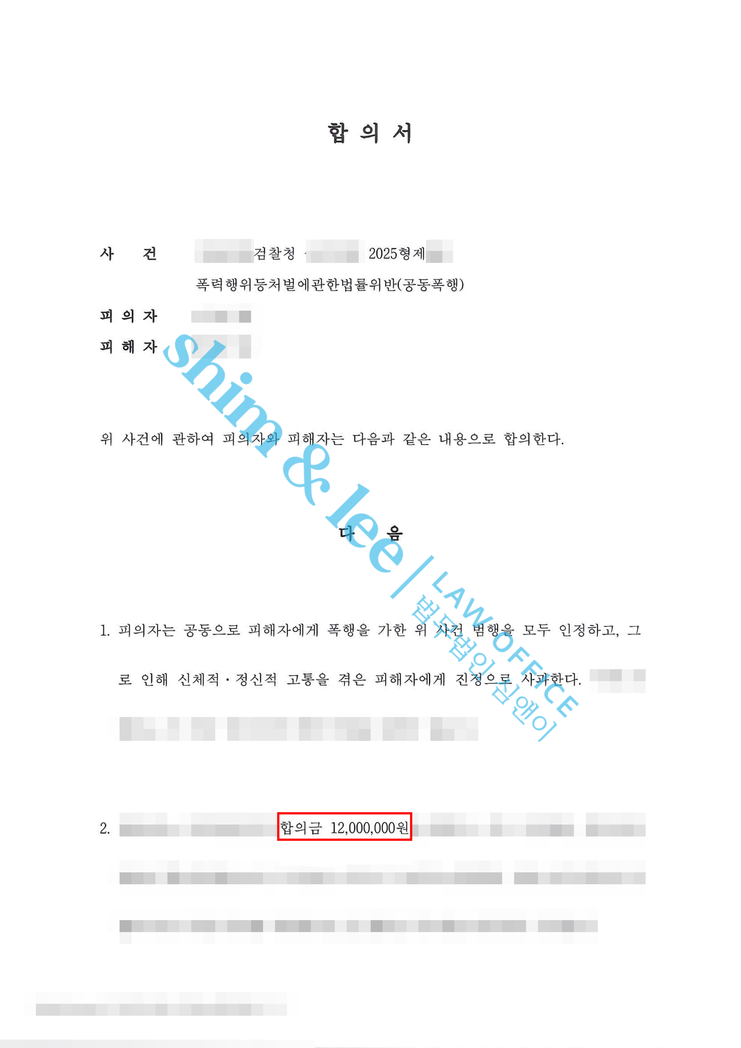 - 대표 변호사님의 단호한 태도에 가해자들은 최종적으로 각각 폭행사건에서는 이례적으로 높은 금액인 합의금 700만 원, 1,200만 원을 제안하고, 진심이 담긴 사과문을 작성해와 극적으로 합의가 이루어졌습니다. 합의서에는 비밀유지, 통신제한, 소제기금지 등 의뢰인에게 유리한 조항을 추가하여 합의를 진행하였습니다.