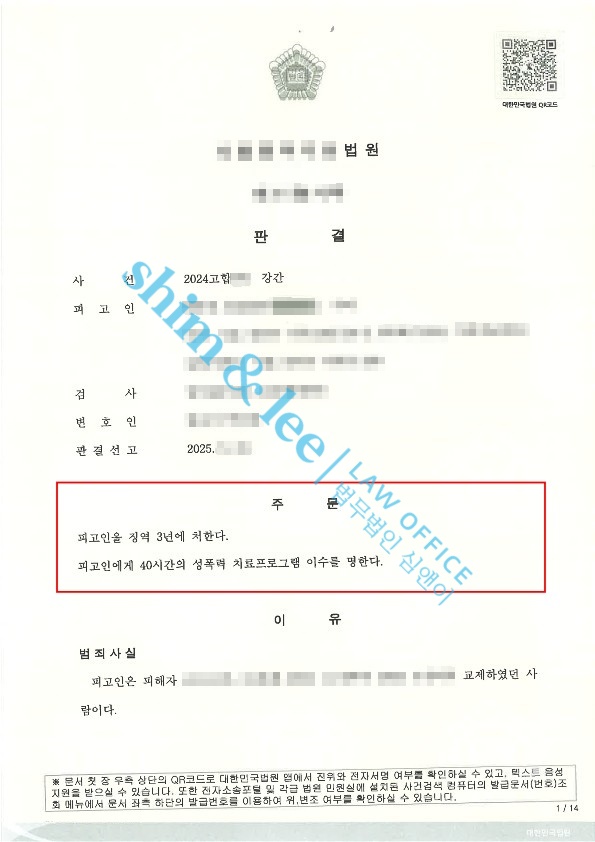 - 그 결과 재판부는 가해자에게 징역 3년과 성폭력 치료 강의 40시간을 선고하였습니다.
