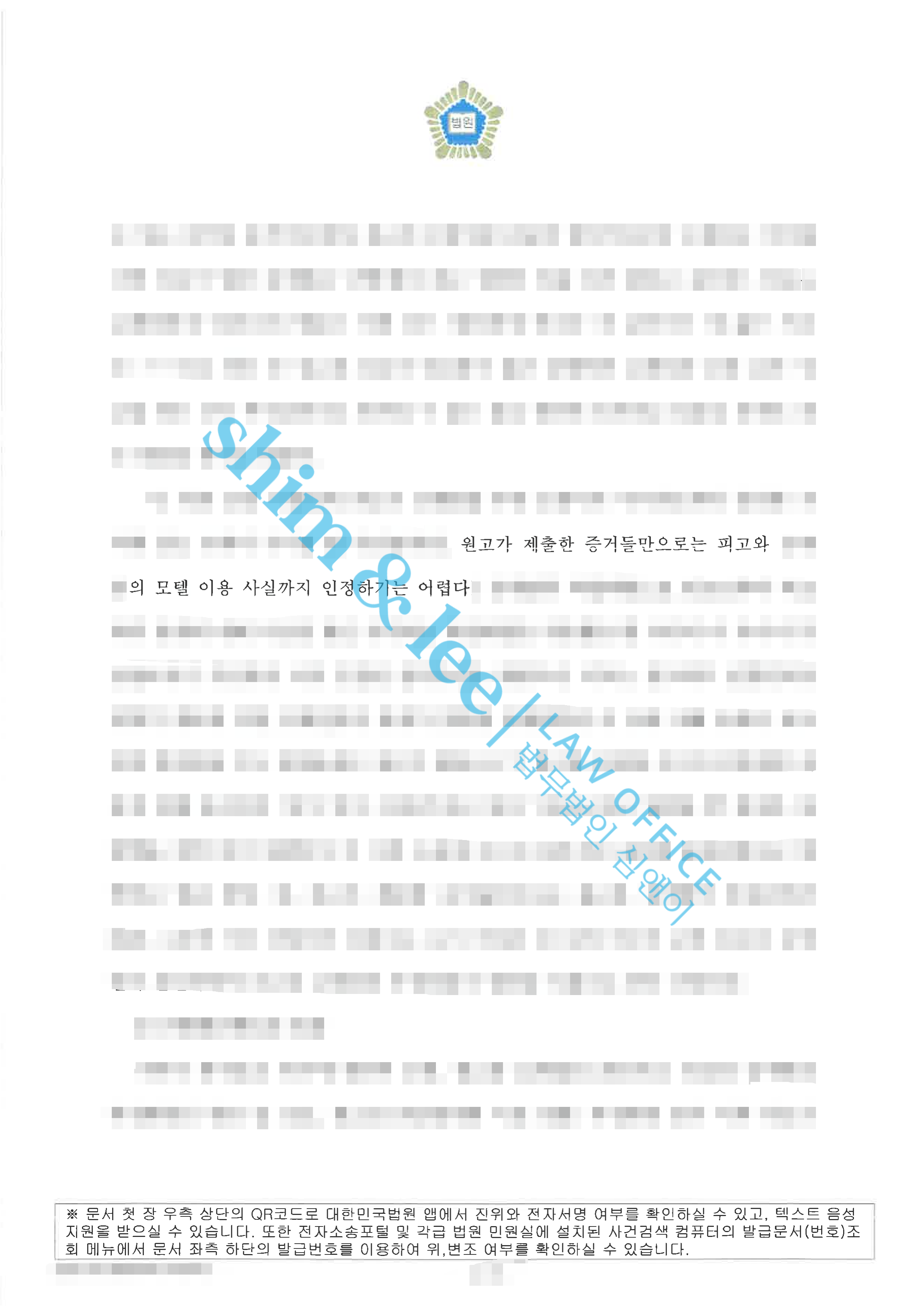 해당 시각, 의뢰인이 작성한 업무 문서와 팀원들과 주고받은 업무 메신저 기록 등을 통해 피고는 당시 업무중이었던 정황을 찾아내며 그 시간대에 피고가 A씨와 함께 있었을 가능성이 없다는 점을 객관적으로 입증하였습니다. 더불어, 원고가 제출한 숙박업소 결제 내역이 부정행위의 직접적인 증거가 될 수 없다는 점을 강력히 피력하였습니다.