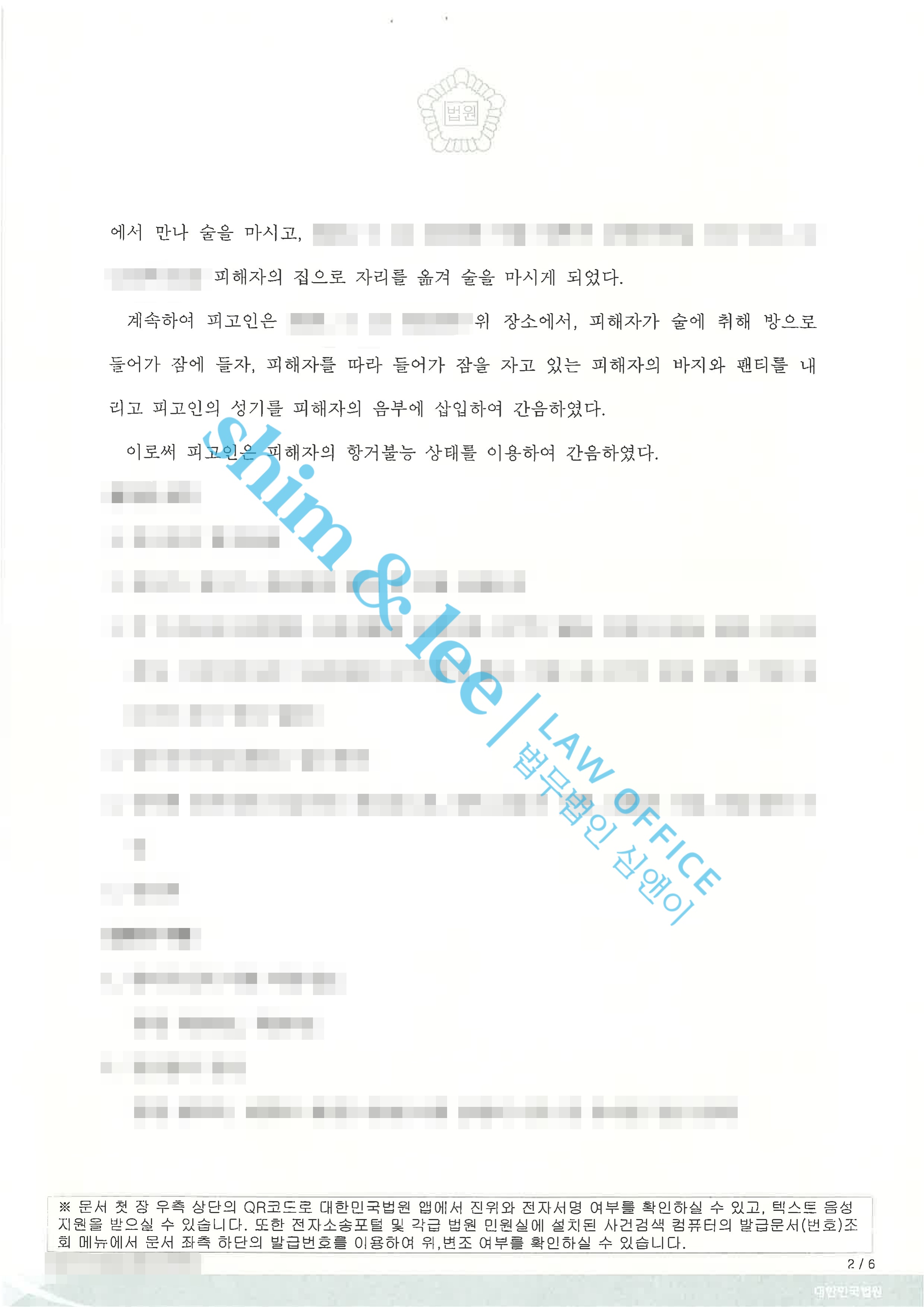의뢰인은 지인들과 술자리를 가졌고, 가해자와는 처음보는 사이였습니다. 2차로는 모두 의뢰인의 집으로 자리를 옮겼습니다. 그날 밤, 술에 많이 취해 깊은 잠에 빠진 의뢰인은 이상한 느낌에 눈을 떠보니 옷이 모두 벗겨진 상태였고, 가해자가 강제로 의뢰인의 음부에 성기를 삽입하고 있었습니다.
