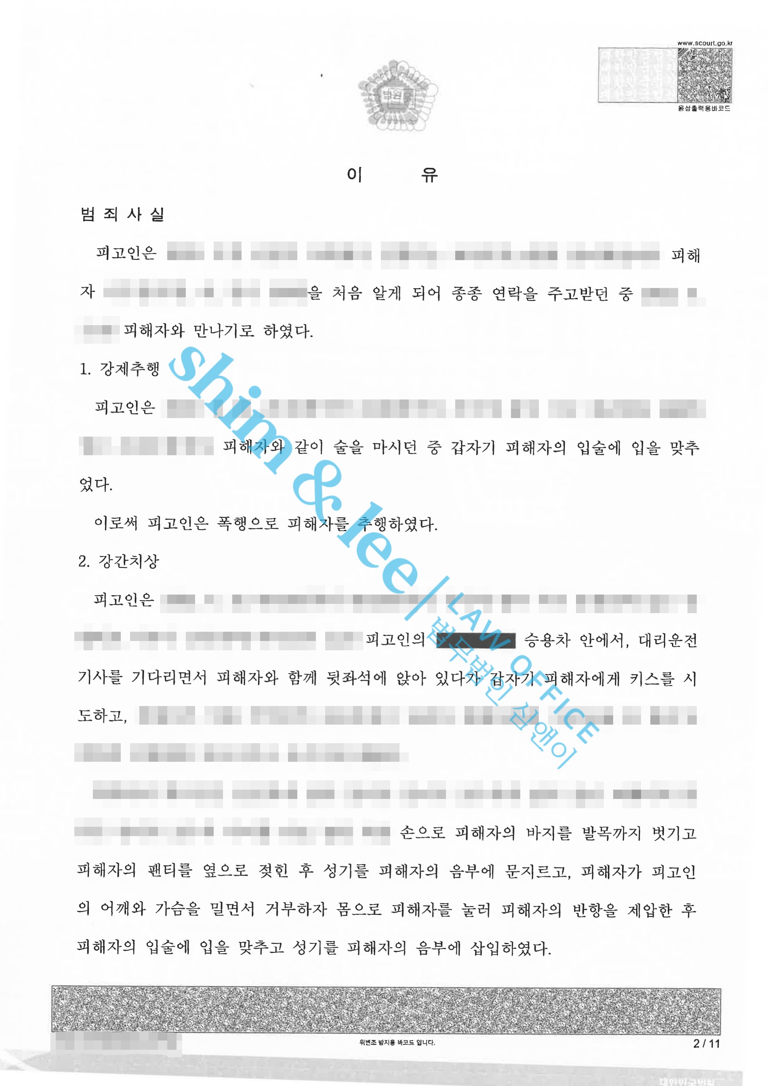 형사고소대학 동기인 가해자와 술을 먹던 중 기습적으로 추행당한 사례 2021.11.23합의금 2,000만 원 -
