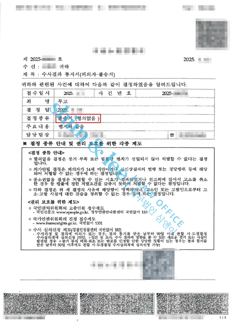 -담당 수사관은 사건을 검토한 끝에, 의뢰인의 진술과 심앤이의 주장을 바탕으로 무고 혐의에 대해 불송치 결정을 내렸습니다.