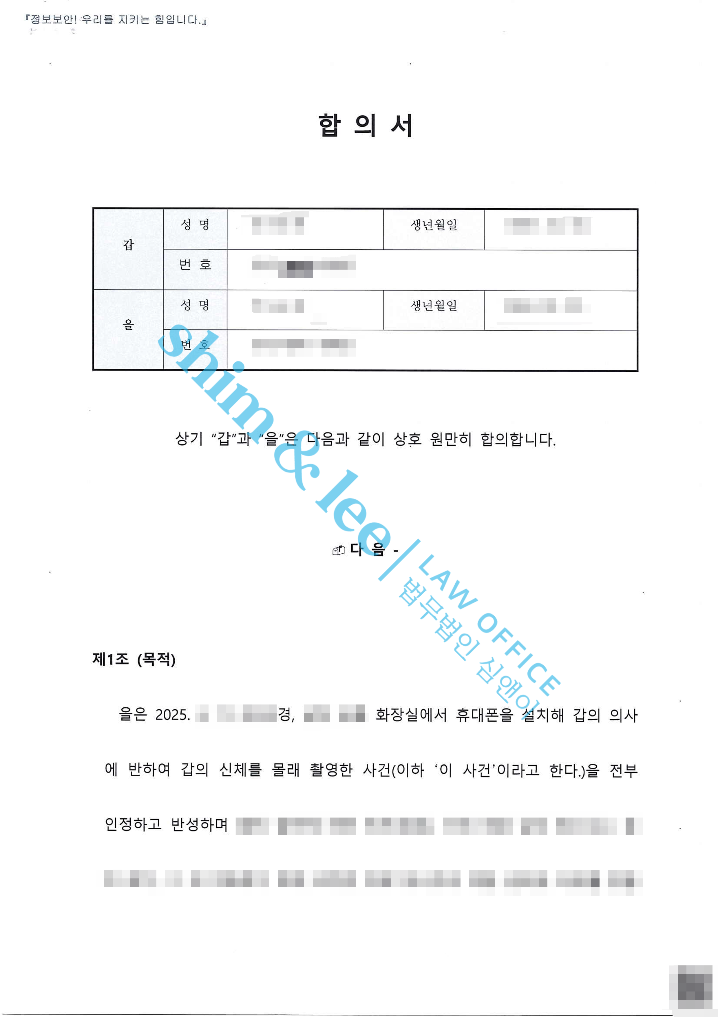 합의대행공중 화장실에서 몰카 피해입은 사건 2025.08.22합의금 1,700만 원 -