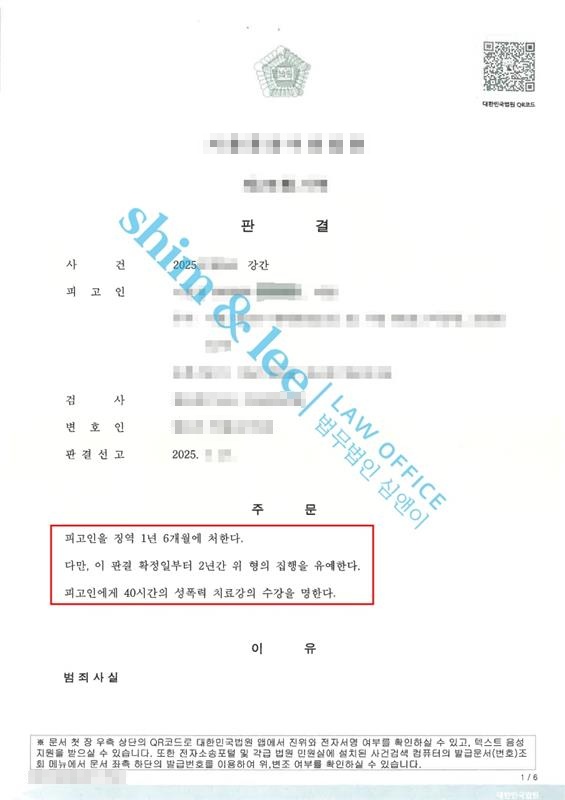 - 가해자는 피해자와 합의까지 이루었으나, 재판부는 피해자의 명확한 거부 의사를 무시하고 간음한 점에서 죄질이 매우 불량하다고 판단, 강간 혐의를 유죄로 인정하여 징역 1년 6개월에 집행유예 2년, 성폭력 치료강의 40시간 이수 명령을 선고하였습니다.