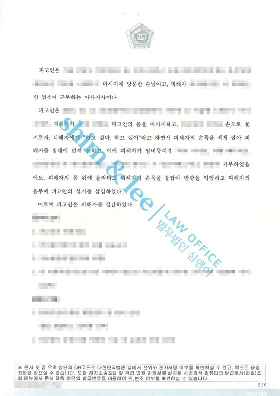 - 담당 변호사님은 수사단계에서만 총 6건의 의견서를 제출하며, 피해자의 반복된 거부 의사와 강제적 삽입 사실을 중심으로 업소의 특성과 무관한 명백한 강간임을 입증하고자 했습니다.