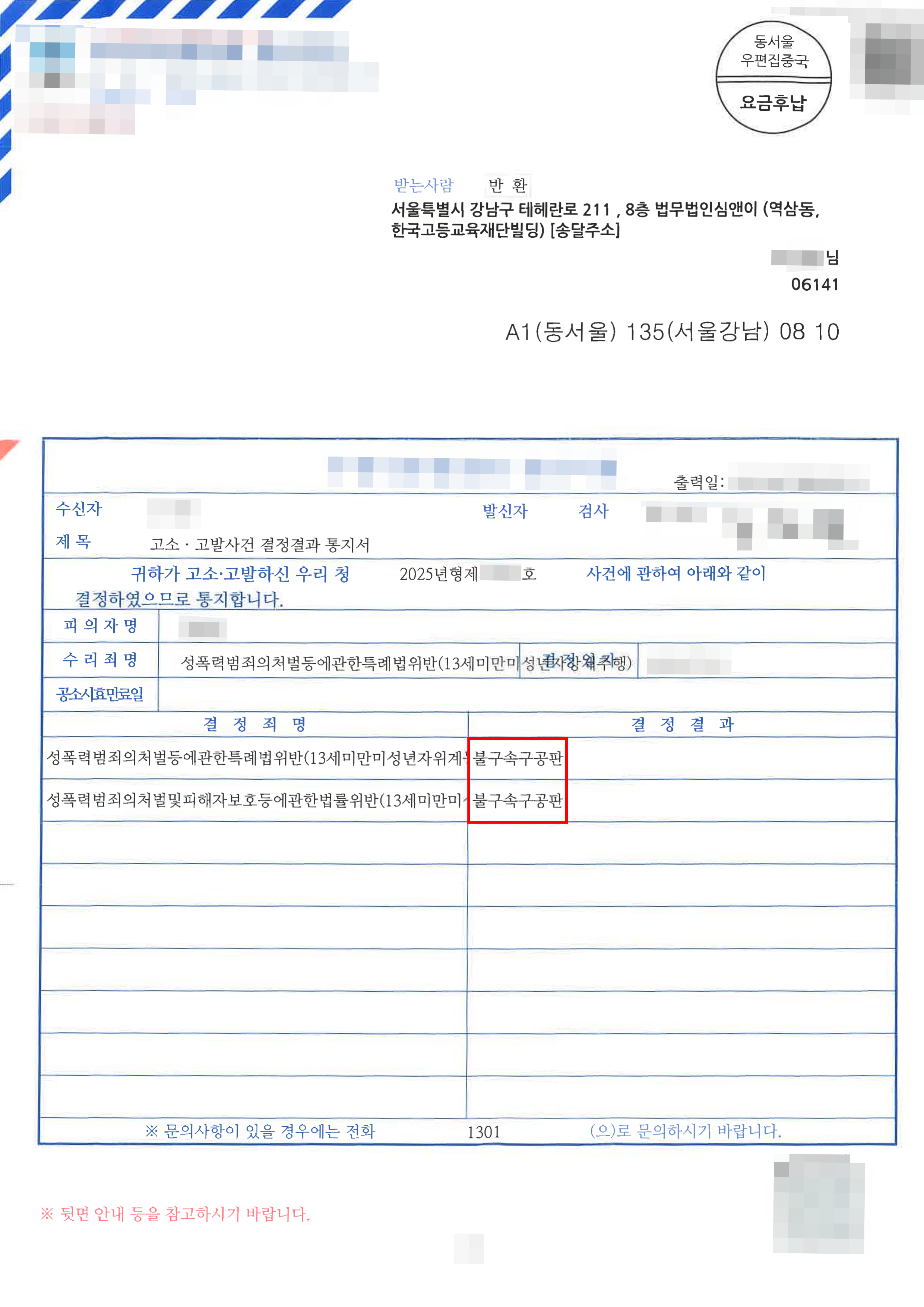 형사고소학원 선생님이 13세 미만 아동을 강제추행, 유사강간한 사건 2025.11.07검찰 송치 -