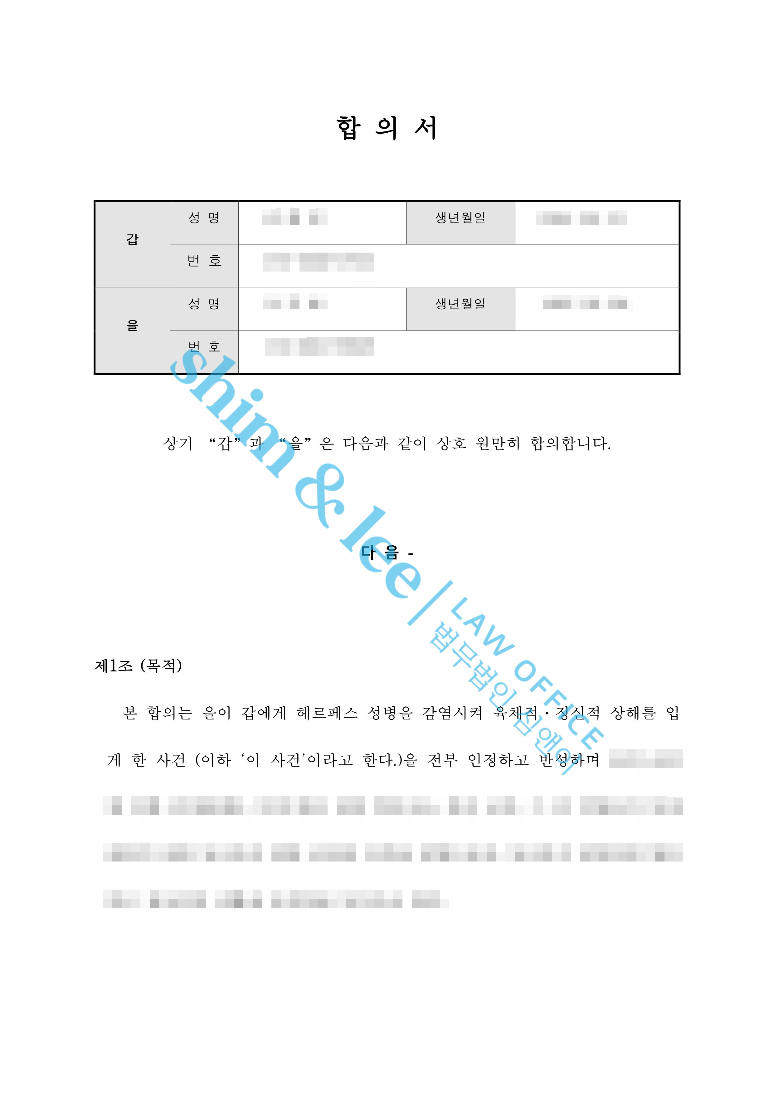 - 이번 사건은 헤르페스 2형 감염 피해와 관련된 사안으로, 상해 또는 과실치상 혐의로 충분히 형사고소가 가능한 경우였습니다. 이처럼 평생 관리가 필요한 질병이 문제되는 사건은 초기 단계에서 변호사의 세밀한 검토가 무엇보다 중요합니다. 이번 사건의 가해자는 상해죄로 처벌될 수 있다는 점을 크게 우려해 고소장 접수 전부터 적극적으로 합의를 요청했고, 결국 원만한 합의가 이뤄졌습니다. 앞으로도 심앤이는 피해자의 상황과 사건의 특성을 충분히 반영한 대응을 통해 의뢰인이 만족할 수 있는 결과를 만들어 나가겠습니다.
