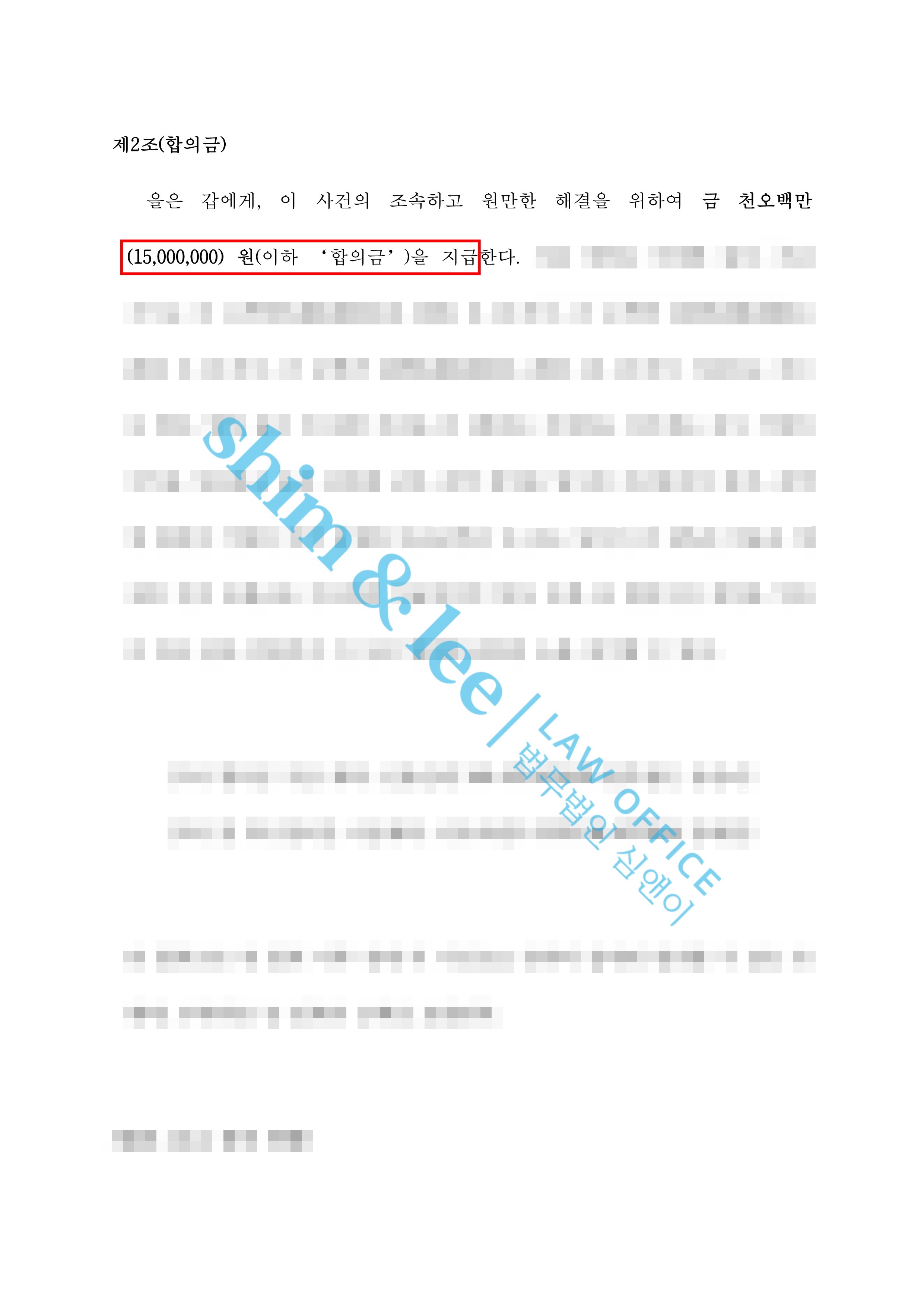 - 가해자는 고소장이 접수되어 사건화 될 것을 우려하여 단시간에 처음 제안한 금액보다 5배 높은 1,500만 원으로 합의를 요청하였습니다. 이에 심앤이는 비밀유지, 통신 제한, 소제기 금지 등 의뢰인을 최대한 보호할 수 있는 구체적인 조항을 포함하여 합의를 이끌어냈습니다.