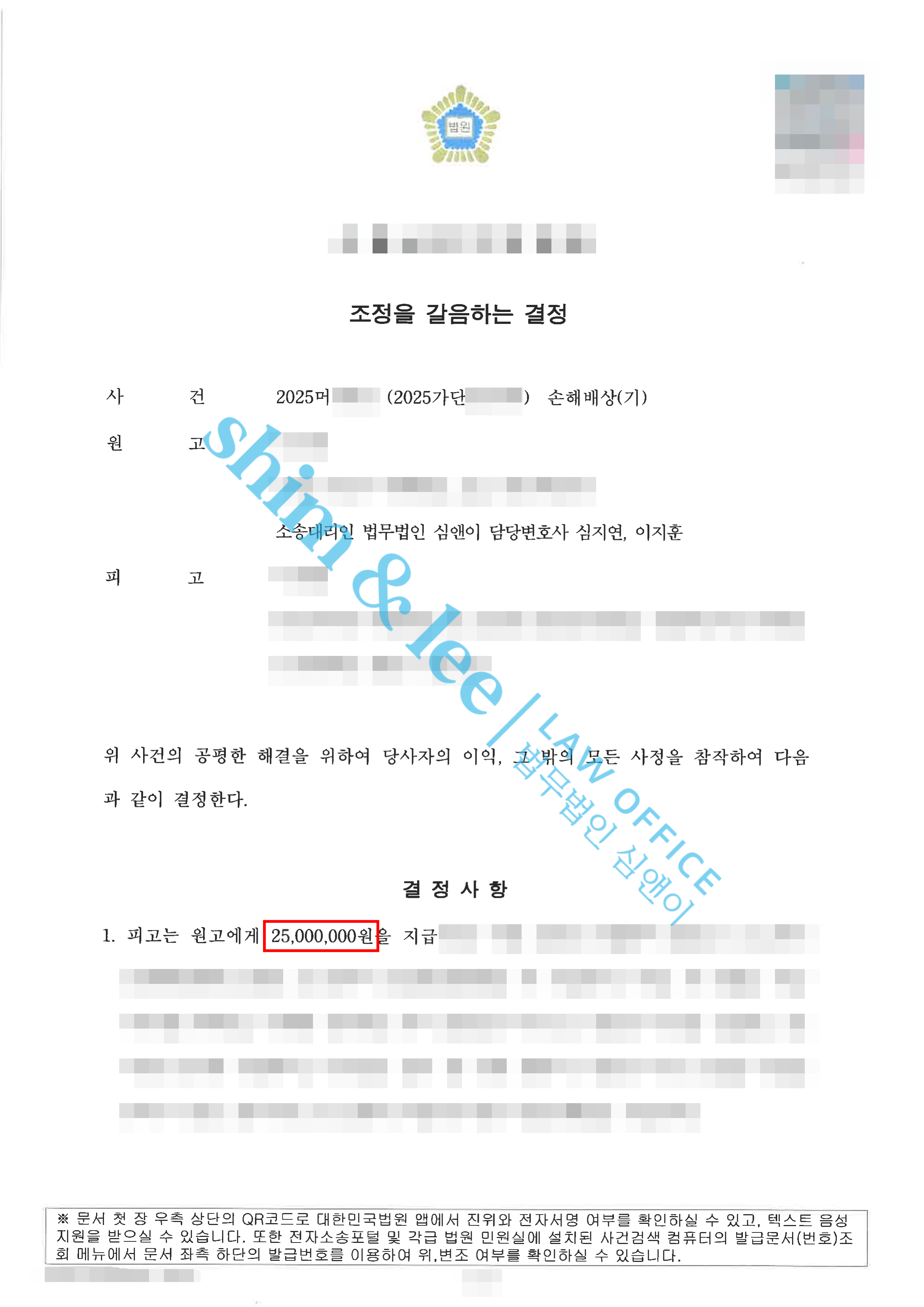 - 재판부는 결국 심앤이의 뜻에 따라 의뢰인에게 유리한 조건을 모두 담은 강제조정을 내려주었습니다. 2,500만 원 지급 외에도 단순한 금전 보상에 그치지 않고, 비밀유지 의무와 접근금지, 위약벌 조항까지 세세하게 포함시켜 의뢰인의 권리를 온전히 반영한 결정을 받게되었습니다.