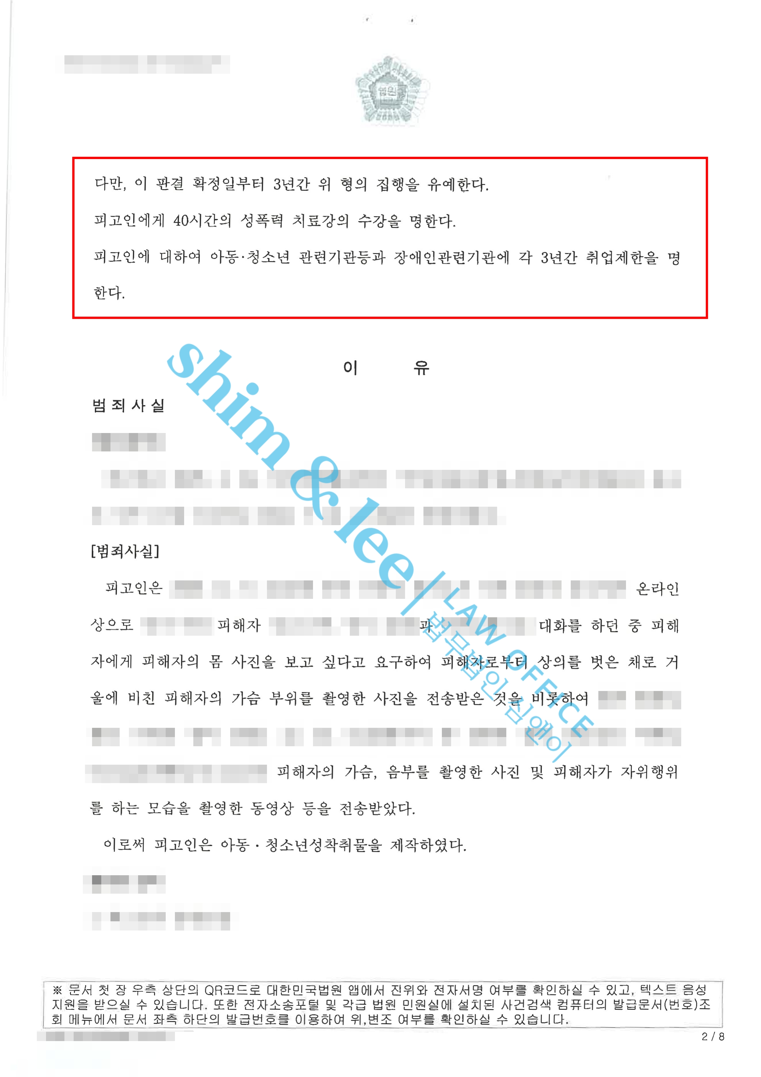 - 가해자는 범행을 인정하고 합의하였음에도 불구하고, 미성년자인 피해자의 건전한 성적 가치관 형성에 부정적인 영향을 끼친 점, 피해자 가족들이 이 사건으로 받은 충격 또한 상당한 점에서 죄질이 무겁다고 판단되었습니다. 이에 재판부는 최종적으로 징역 2년, 집행유예 3년과 함께 성폭력 치료강의 40시간, 취업제한 3년을 선고하였습니다.