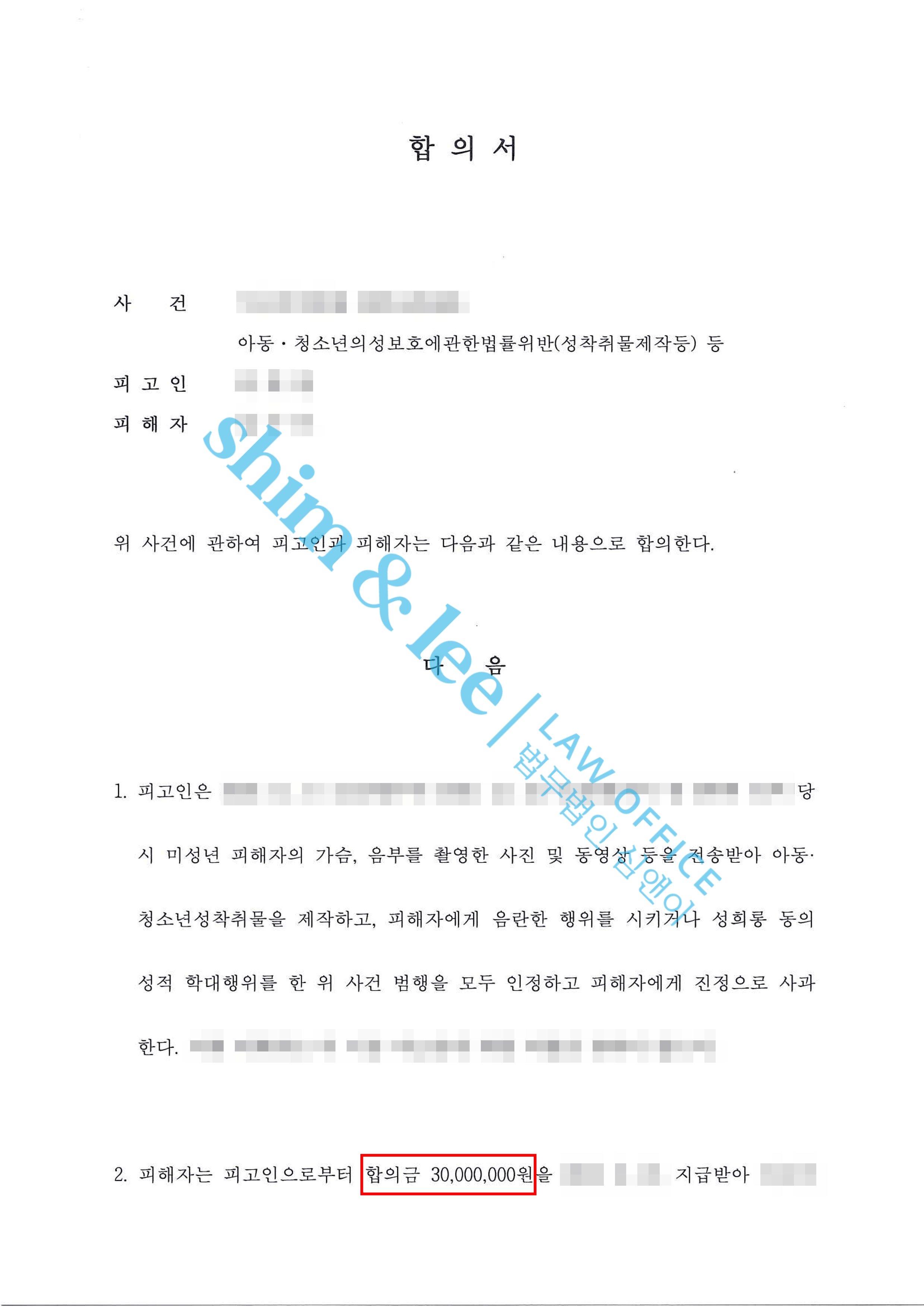 - 심앤이의 압박으로 가해자는 곧바로 사죄와 반성의 의사를 전하며, 경제적 사정을 이유로 합의금 1,500만 원을 제시하며 합의를 요청하였습니다. 이에 대표 변호사님은 ① 피해자는 어린 나이에 피해를 당한 후, 약 5년이 지나 성인이 된 현재까지도 가해자가 찾아오거나 사진이 유출될까 불안해하고 있는 점, ② 가해자는 성적 자기결정권을 완전히 행사할 능력이 충분하지 않은 미성년자를 대상으로 반복적으로 성적 사진과 영상을 요구하고 성착취물을 제작한 점을 지적하며 제시한 금액은 피해의 중대성과 장기적 고통에 비해 현저히 부족하다는 점을 명확히 전달하였습니다. -