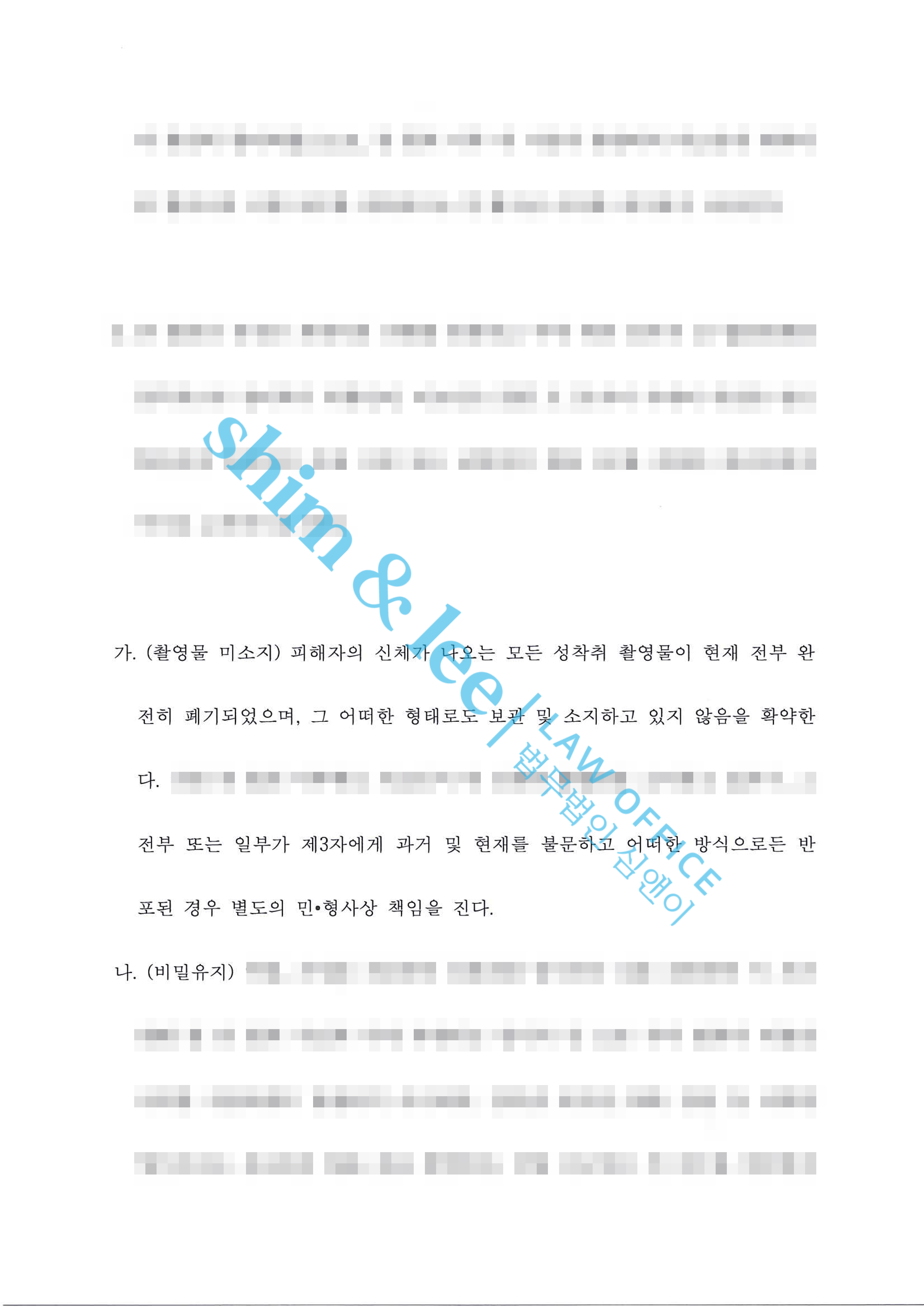 - 이에 심앤이는 촬영물 미소지, 비밀유지, 접근·보복 금지, 통신제한, 소제기금지 등 핵심 조항과 함께 해당 조항을 1회라도 위반할 경우 합의금의 배액을 추가 지급하도록 한 위약벌 조항까지 포함하여, 의뢰인을 최대한 보호할 수 있는 구체적인 조항을 꼼꼼히 작성하여 합의를 성사해냈습니다.