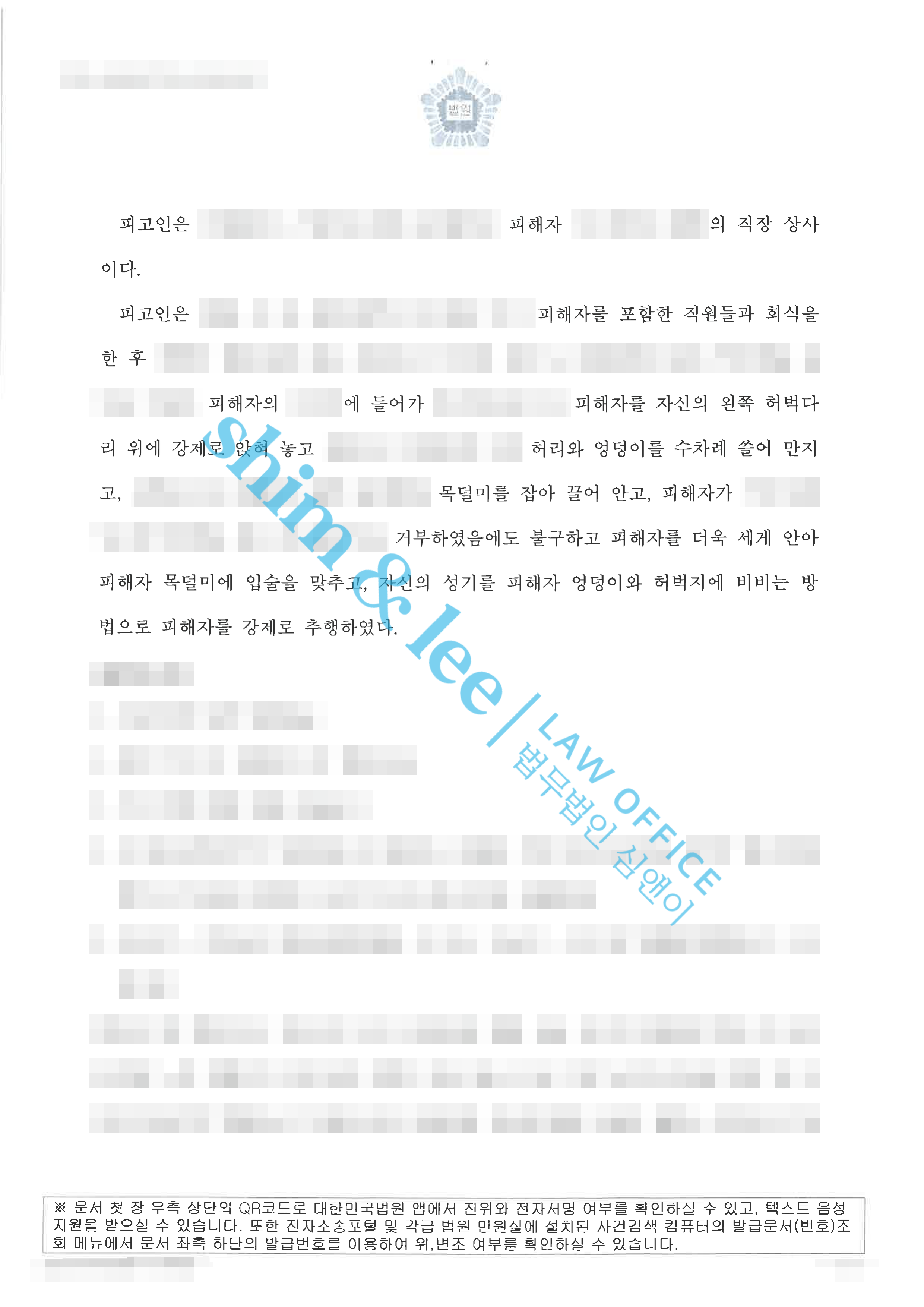 형사고소직장 상사가 산책 중 갑자기 성관계를 요구하며 강제로 추행한 사례 2022.01.03합의금 2,000만 원 / 기소유예 -