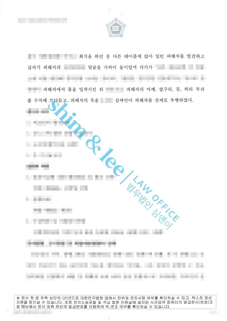 -가해자는 식사 중이던 의뢰인의 옆으로 다가와 얼굴을 밀착시킨 채 어깨, 허리, 옆구리 등을 차례로 쓰다듬었고, 나아가 “뽀뽀 좀 해달라”는 발언까지 하며 의뢰인은 극심한 수치심과 불쾌감을 느꼈습니다.