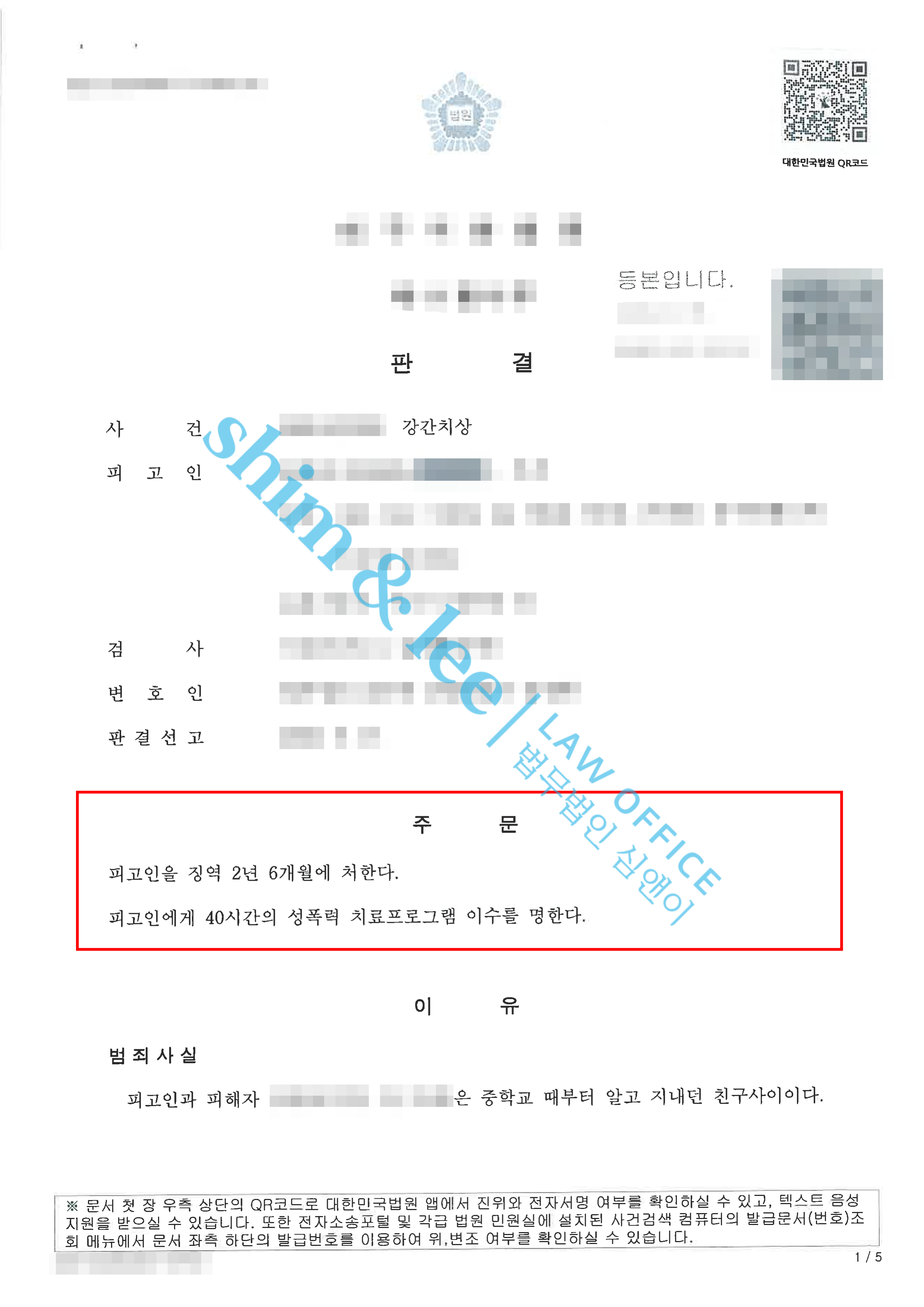 - 결국 재판부는 피고인이 피해자로부터 용서받은 사실이 없고, 피해자는 피고인에 대한 엄벌만을 원하고 있다는 점을 고려하여, 징역 2년 6개월(법정구속)과 성폭력 치료강의 40시간을 선고했습니다.