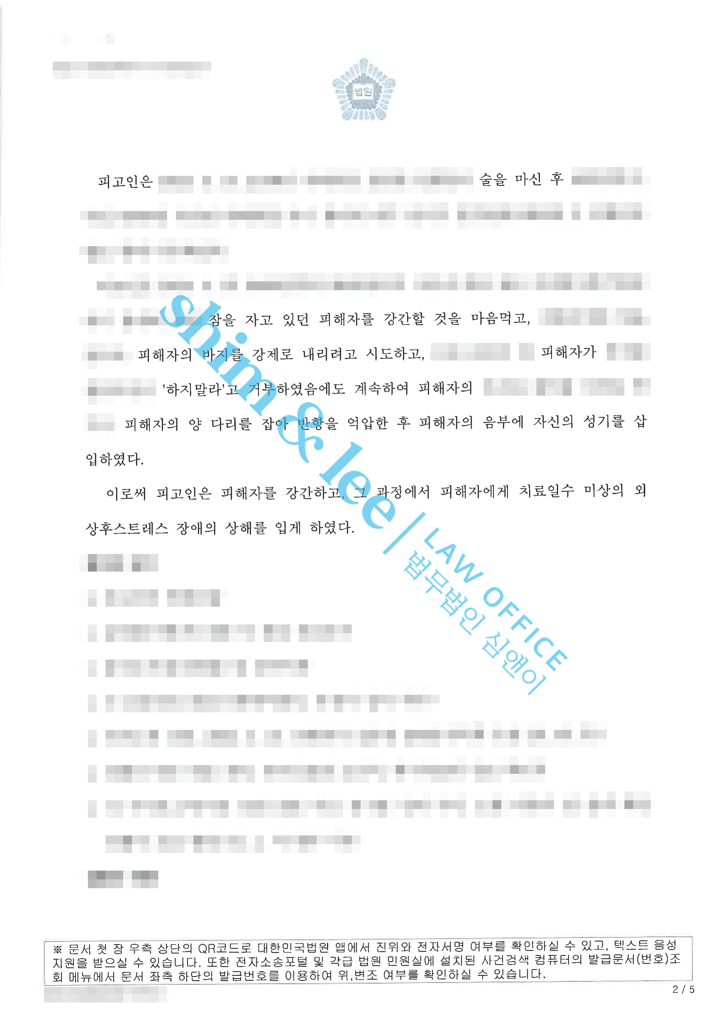 - 그리고 의뢰인이 입은 정신적, 신체적 피해로 인한 PTSD 증상은 장기적인 치료가 필요한 중대한 상해에 해당함을 강조하며, 수사기관에 죄명을 강간이 아닌 강간치상으로 검토해 줄 것을 강력히 요청했습니다.