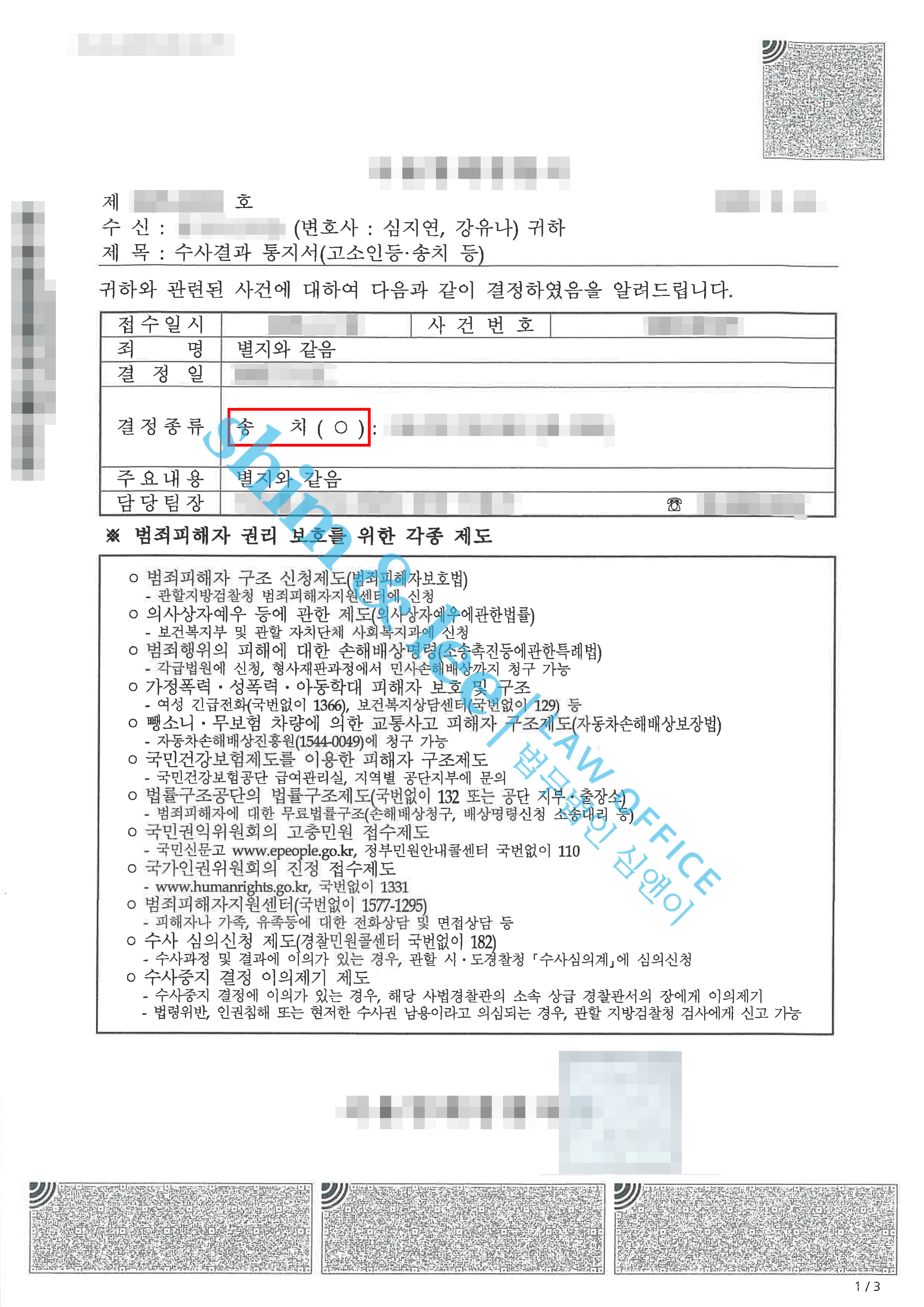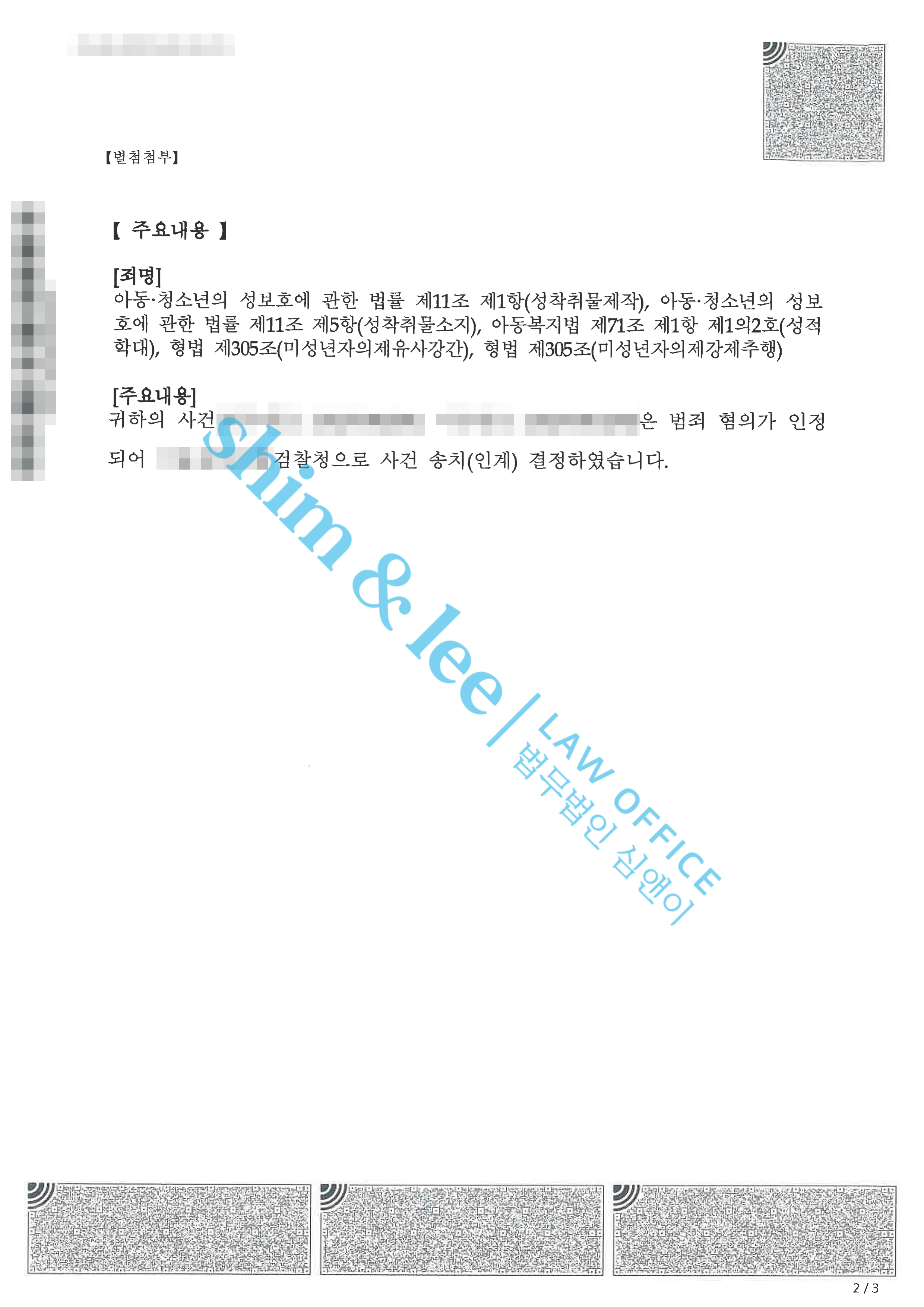 - 결국 사건은 대표 변호사님이 특정했던 미성년자의제유사강간, 미성년자의제강제추행, 아청법위반(성착취물제작), 아청법위반(성착취물소지), 아동복지법위반 다섯 가지 죄명 모두에서 가해자의 범행이 인정되어 검찰로 송치되었습니다.