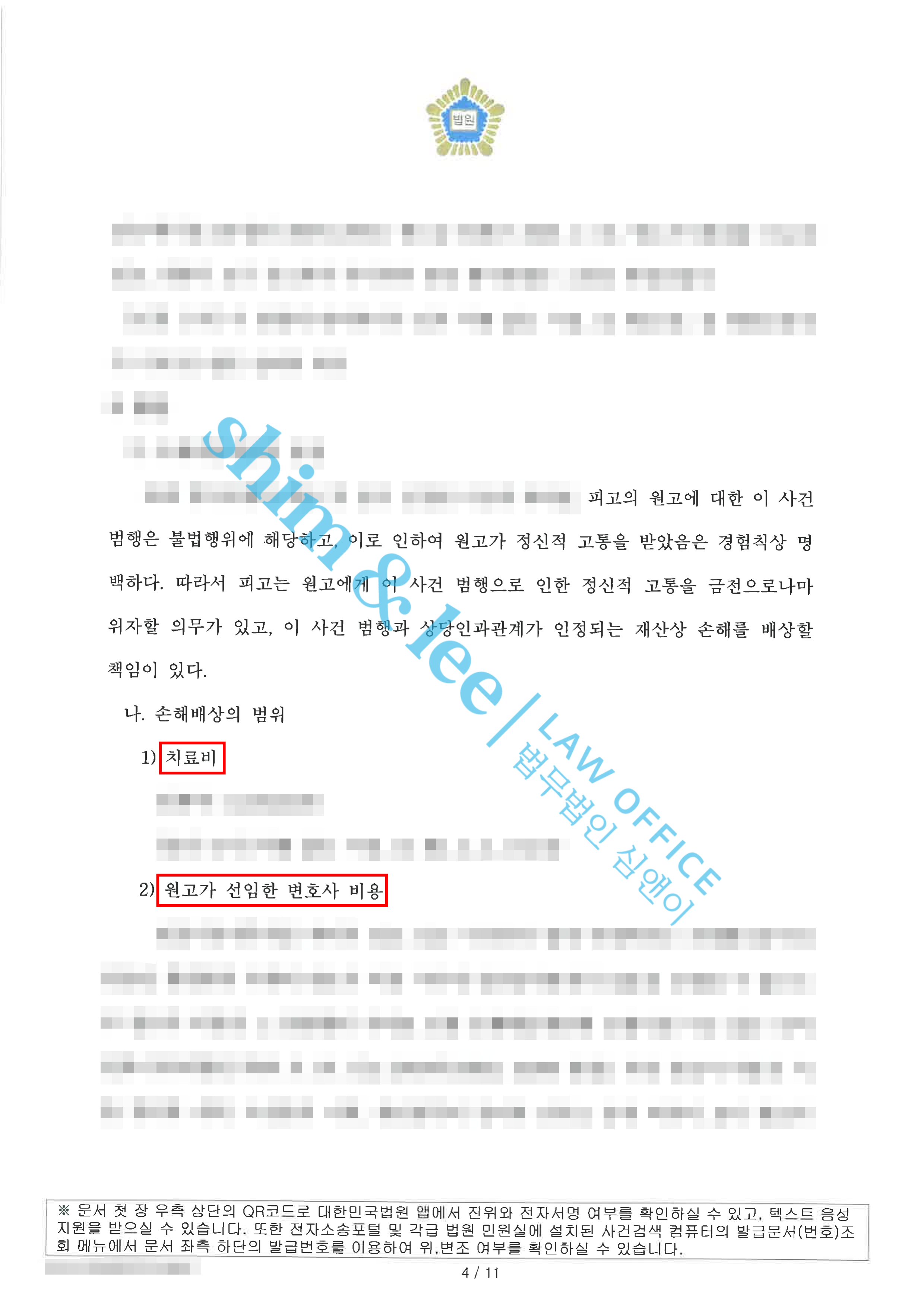 - 심앤이는 상담 내용이 상세히 기록된 진료 기록부와 진료비 영수증을 증거로 제출하여, 이 치료비는 단순 심리 위로가 아니라 성범죄 트라우마로 무너진 기본적인 생존을 위해 필수적으로 지출된 비용이며, 피고의 불법행위와 인과관계 있는 적극적 손해로서 배상되어야한다고 주장하였습니다.