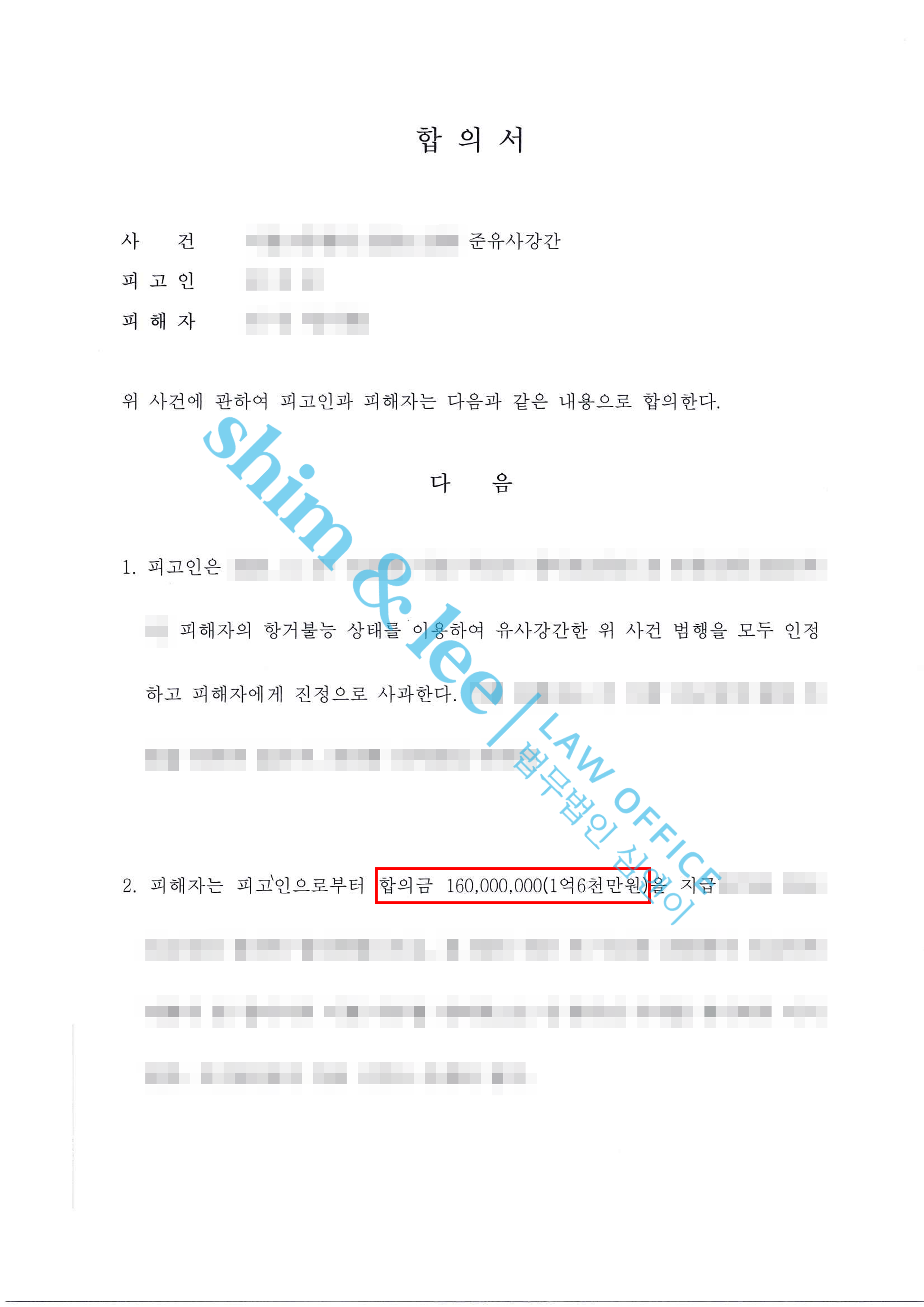 - 법정구속 되어 있던 가해자는 합의가 간절한 상황이었기에 합의금을 대폭 증액하여 형사 공탁금의 8배에 해당하는 1억 6천만 원을 최종 합의금으로 제시했고, 결국 선고 직전 극적으로 합의가 이루어졌습니다.