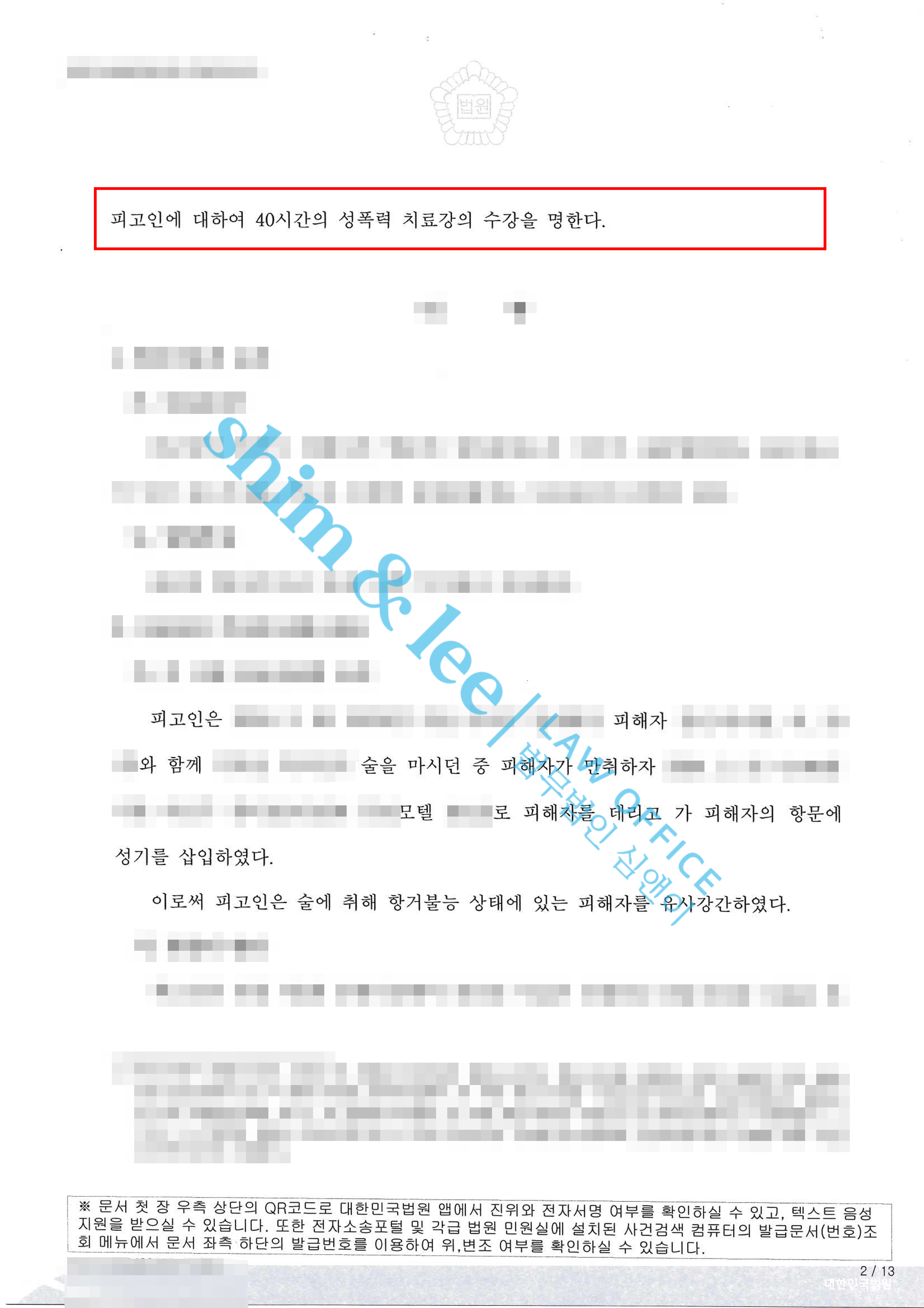 성폭력 치료강의 40시간 / 합의금 2,000만 원 -