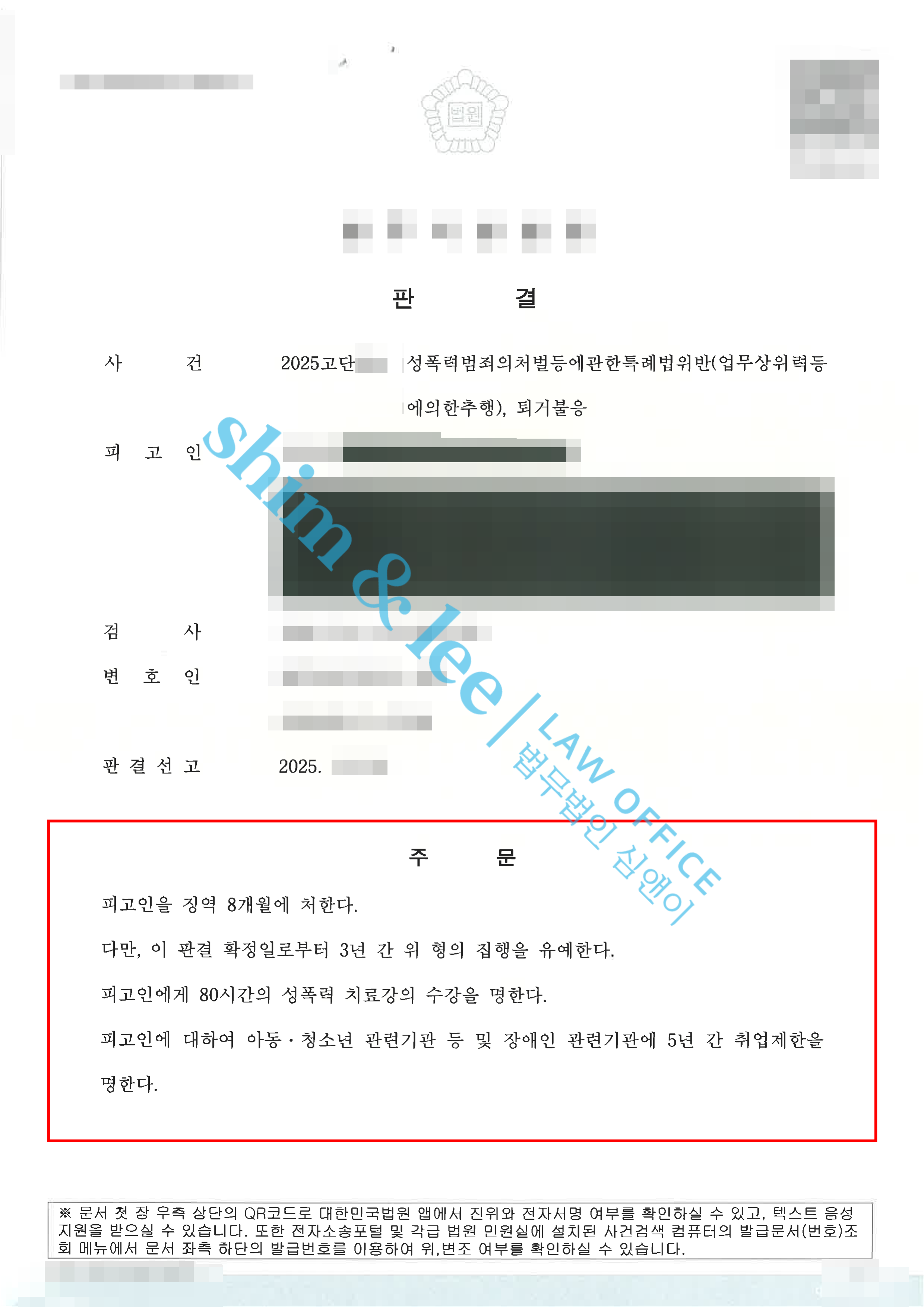 - 최종적으로 가해자는 징역 8개월, 집행유예 3년, 성폭력 치료강의 80시간, 취업제한 5년을 선고받았습니다.