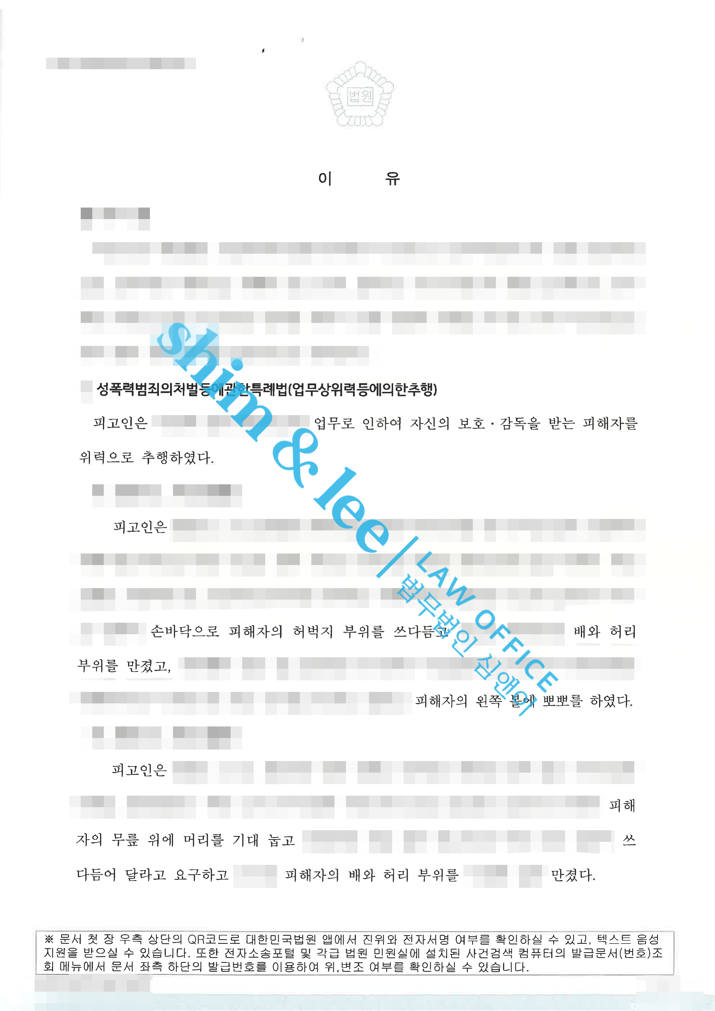 형사고소직장 상사인 가해자로부터 2년 동안 약 30차례 추행당한 사례 2021.11.30징역 1년 6월 / 집행유예 3년
