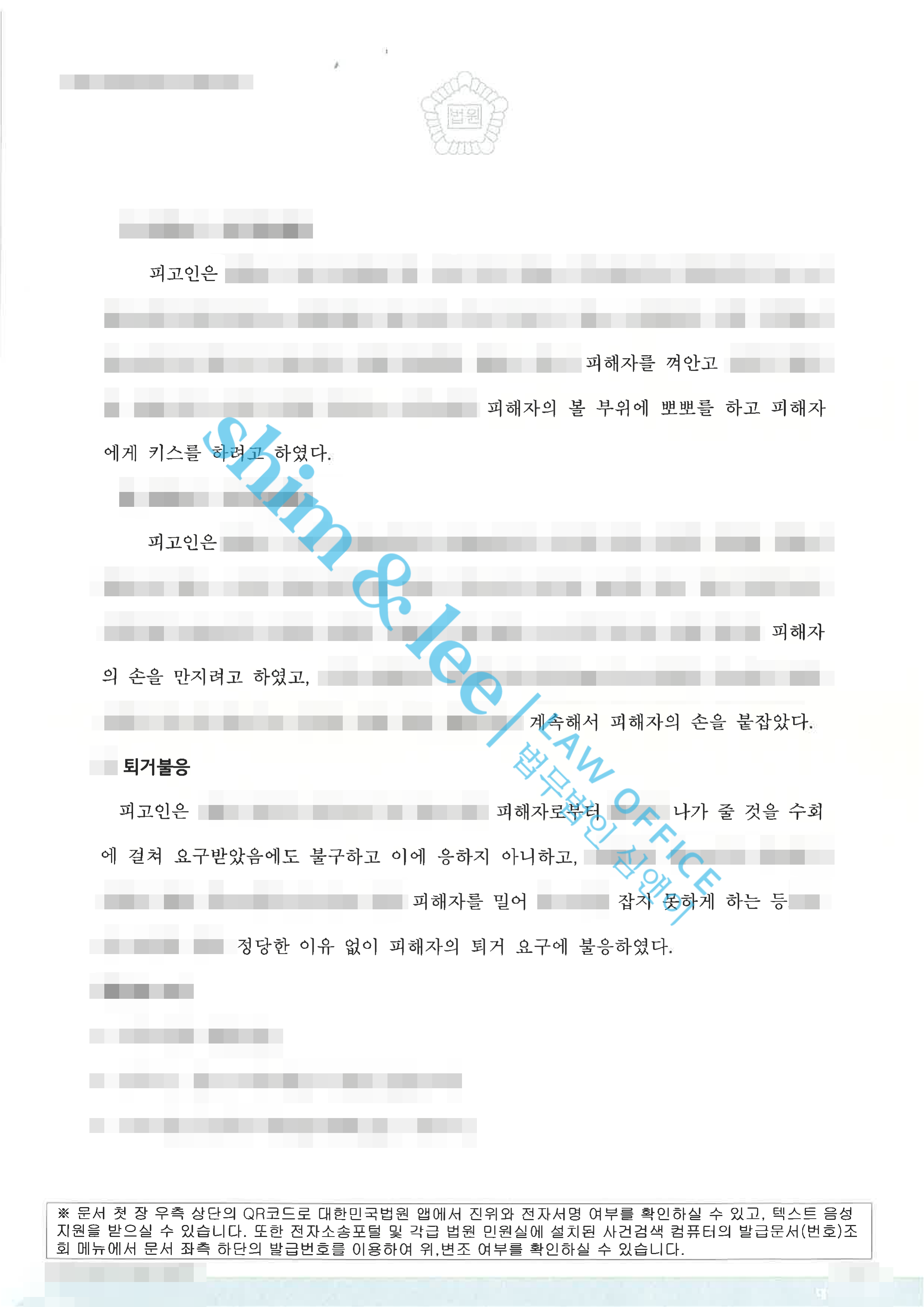 형사고소연인 간 강제추행 성립, 이별 후 전 남자친구의 보복 범행 사례 2021.10.21합의금 3,000만 원 -