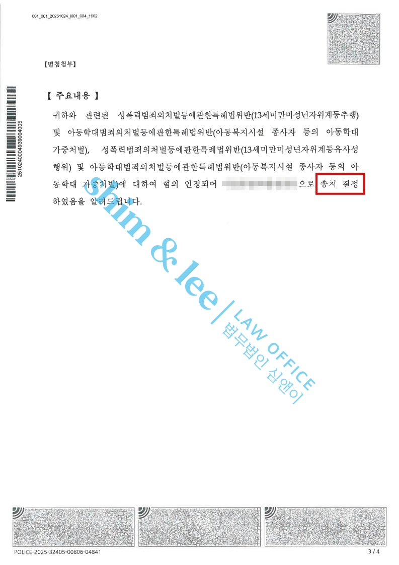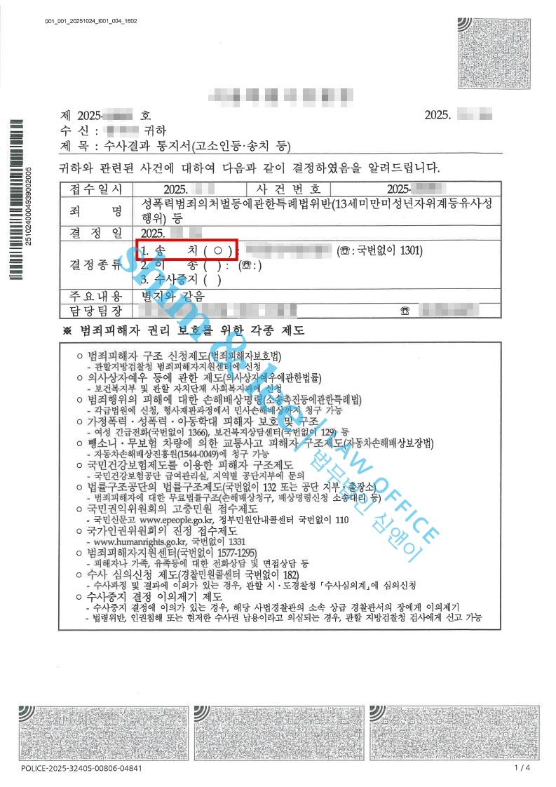 - 담당 수사관은 가해자에게 [13세미만미성년자위계등유사성행위등] 혐의가 인정된다고 판단하여 사건을 검찰에 송치했습니다. 심앤이는 철저히 대비해 기소 결정이 내려질 수 있도록 할 것이며, 가해자가 법의 심판을 받을 수 있도록 끝까지 최선을 다할 예정입니다.