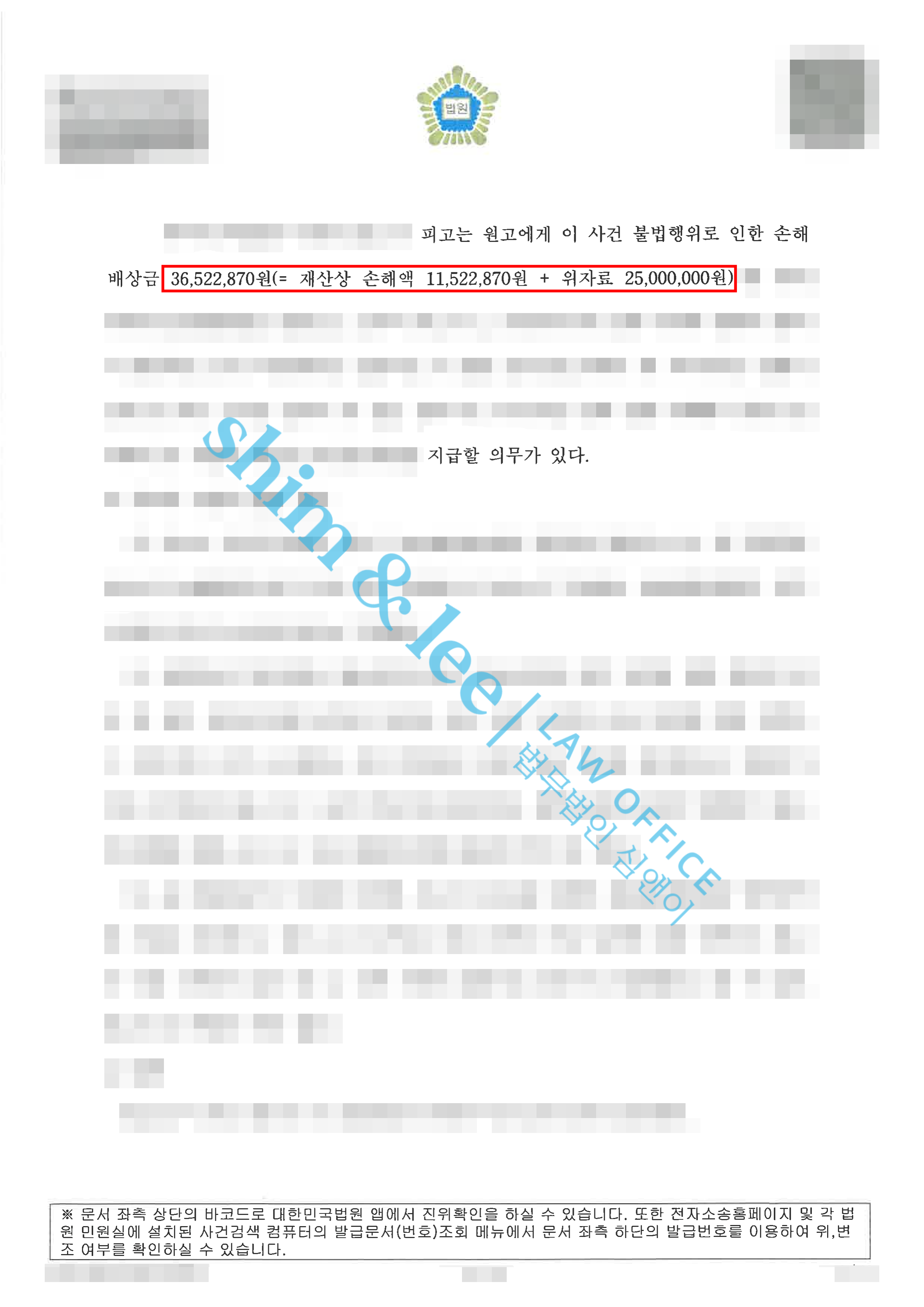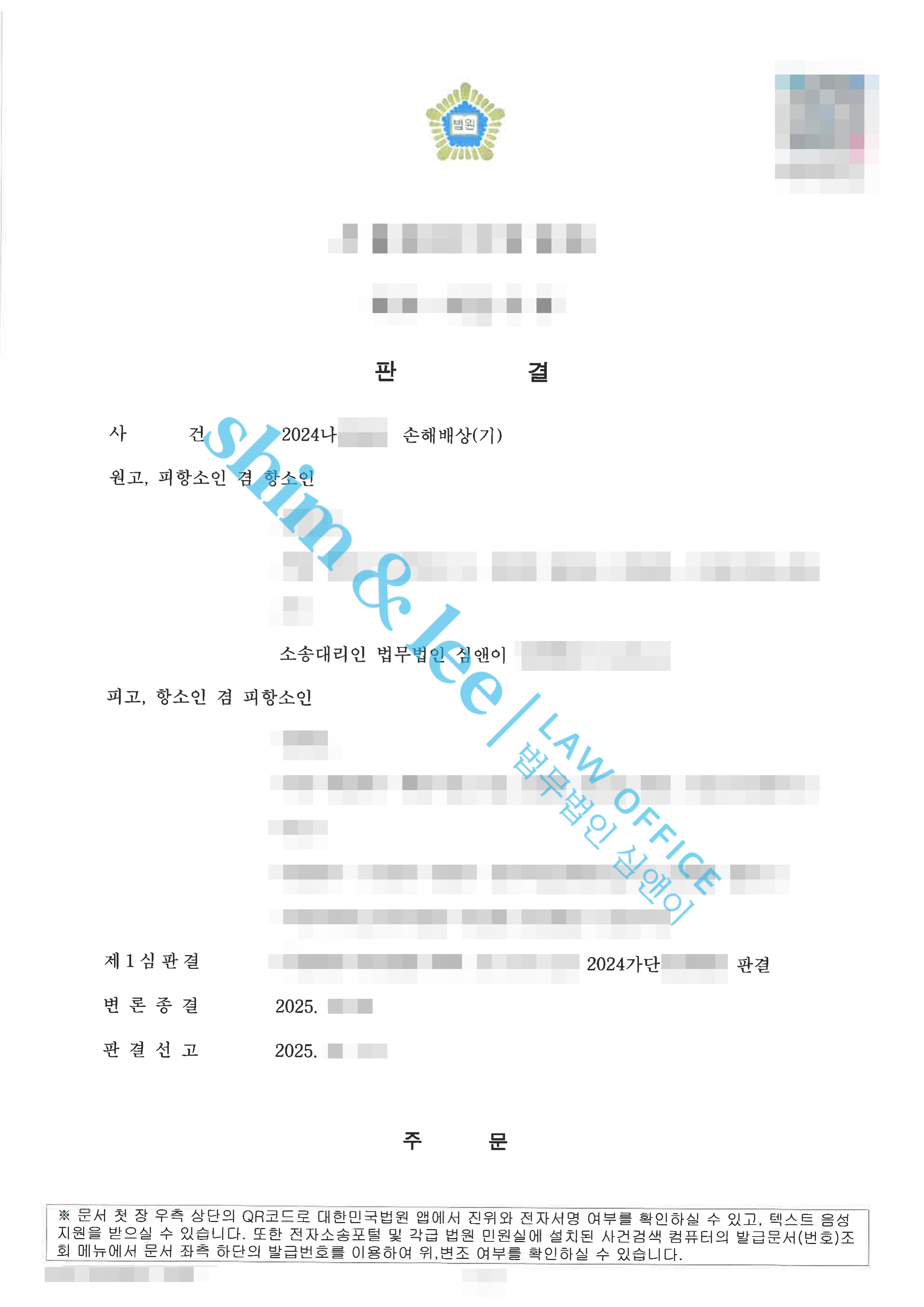 - 판결 내용을 전달받은 피해자는 결과에 매우 만족하시며 오랜 시간 동안 자신을 위해 싸워준 심앤이에 깊은 감사 인사를 전하셨습니다. 오늘의 사례는 심앤이의 논리적인 양질의 서면과 꼼꼼한 사건 진행이 피해보상금 증액으로 이어진 매우 뿌듯한 사건이었습니다.