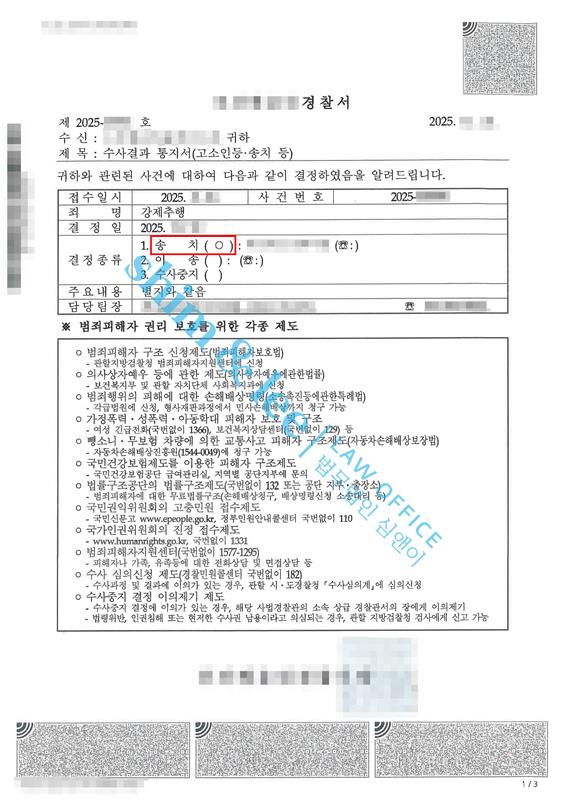 - 의견서를 통해 가해자의 비상식적이고 모순된 주장을 반박하고 사실관계를 명확히 한 결과, 사건은 ‘강제추행’ 혐의로 검찰에 송치되었습니다.
