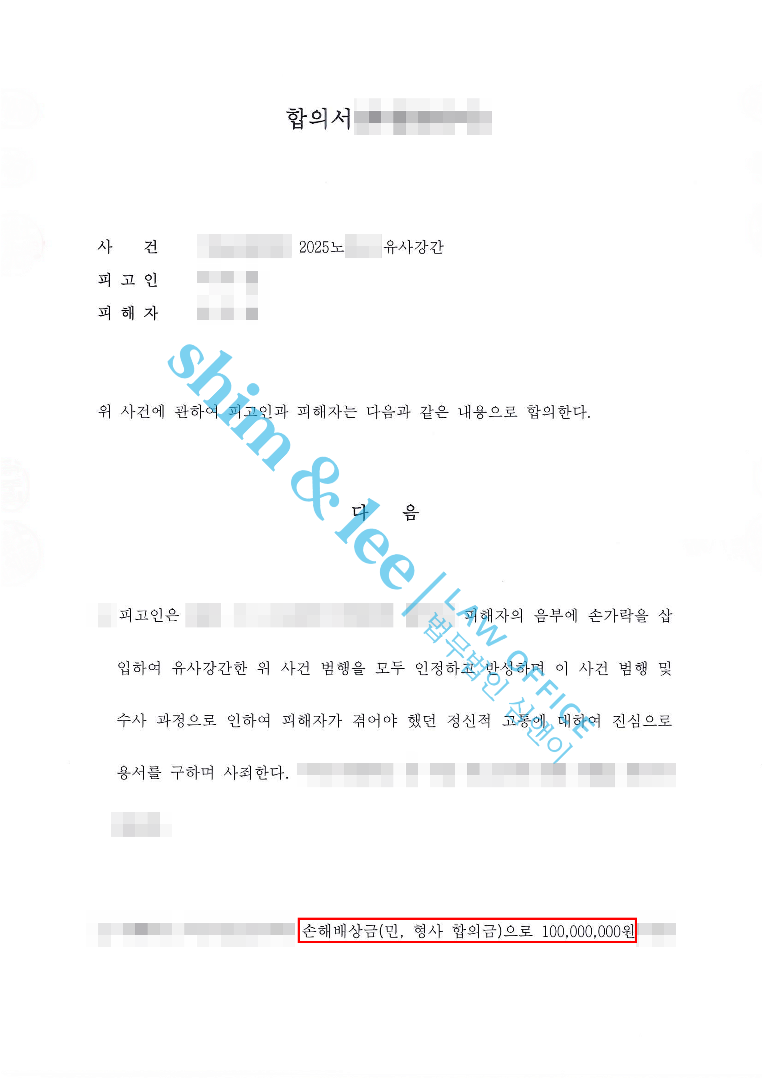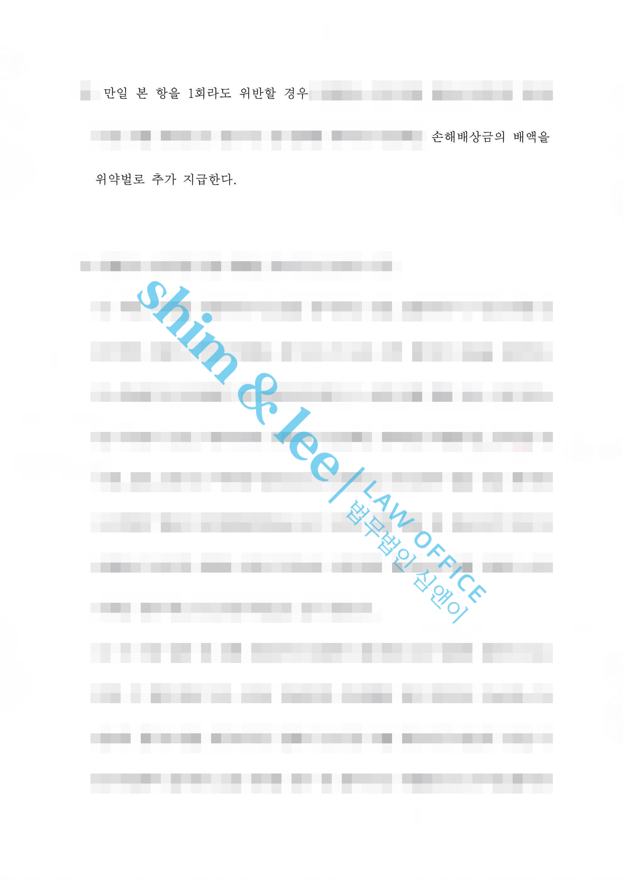 - 선고기일이 임박하자 더욱 마음이 급해진 가해자는 1억원을 일시납 하겠다며 합의를 제안하였습니다. 이에 대표 변호사님은 비밀유지, 접근 및 보복금지, 통신제한, 소제기 금지 등 추후 보복 가능성을 완전히 차단하고 피해자를 보호하는 부가 조항을 넣고, 가까운 지인 사이였던 피해자와 가해자의 관계를 고려하여 가해자의 아내도 조항 의무자로 추가하였습니다. 특히, 해당 조항을 1회라도 위반할 경우 합의금의 배액을 추가 지급하는 위약벌 조항까지 포함하여 합의서를 꼼꼼히 작성하였습니다. 가해자는 심앤이가 제시한 모든 조건을 수용하며 극적으로 합의가 이루어졌습니다.