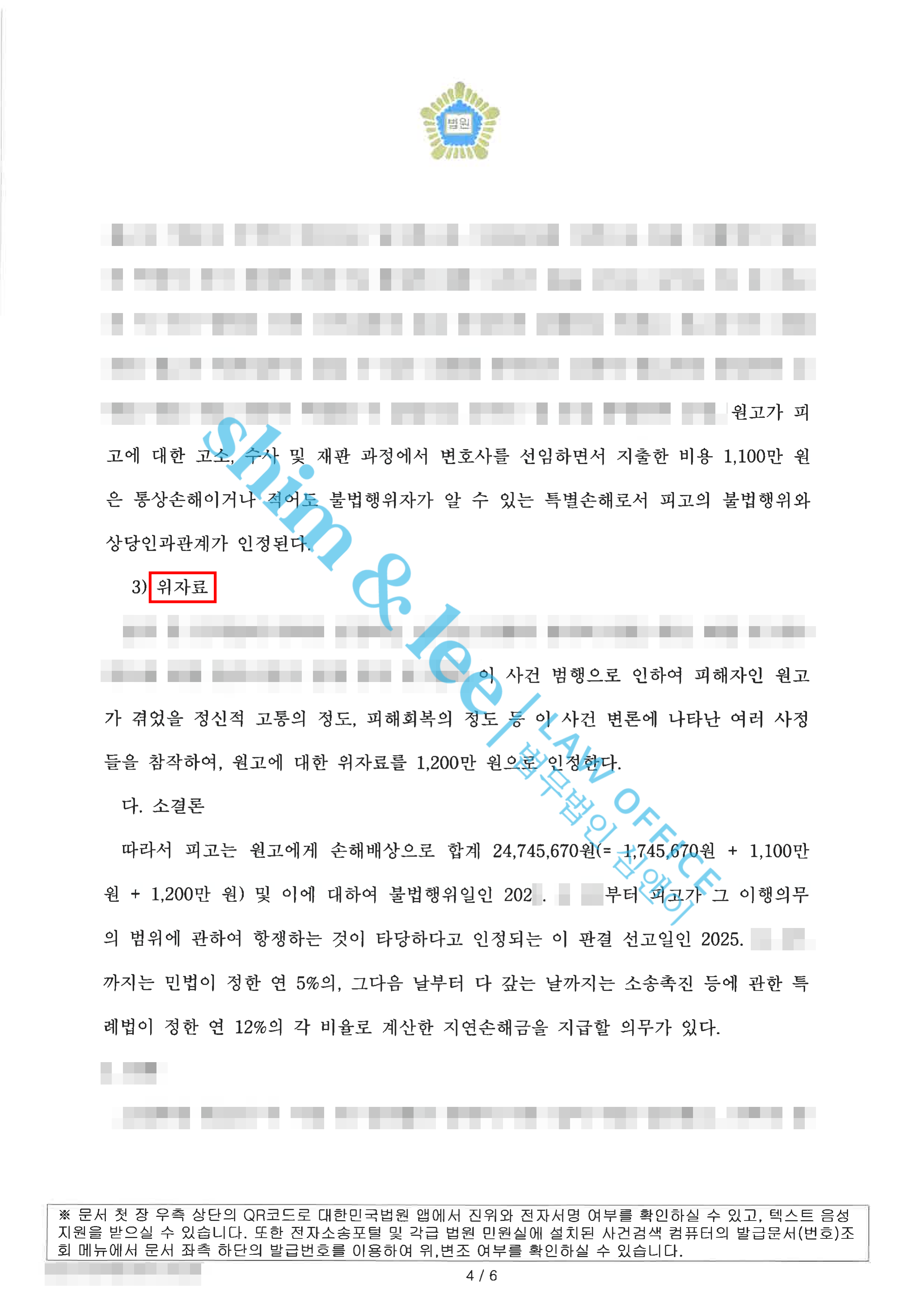 - 최종적으로 민사 재판부는 피고에게 손해배상 책임이 있음을 인정하고, 원고가 청구한 ① 실제로 지출한 적극적 손해인 치료비, ② 형사소송에서 사용한 변호사 선임 비용, ③ 피고의 불법행위로 인한 정신적 피해에 대한 위자료를 모두 받아들여 총 24,745,670원의 손해배상금을 인용했습니다.