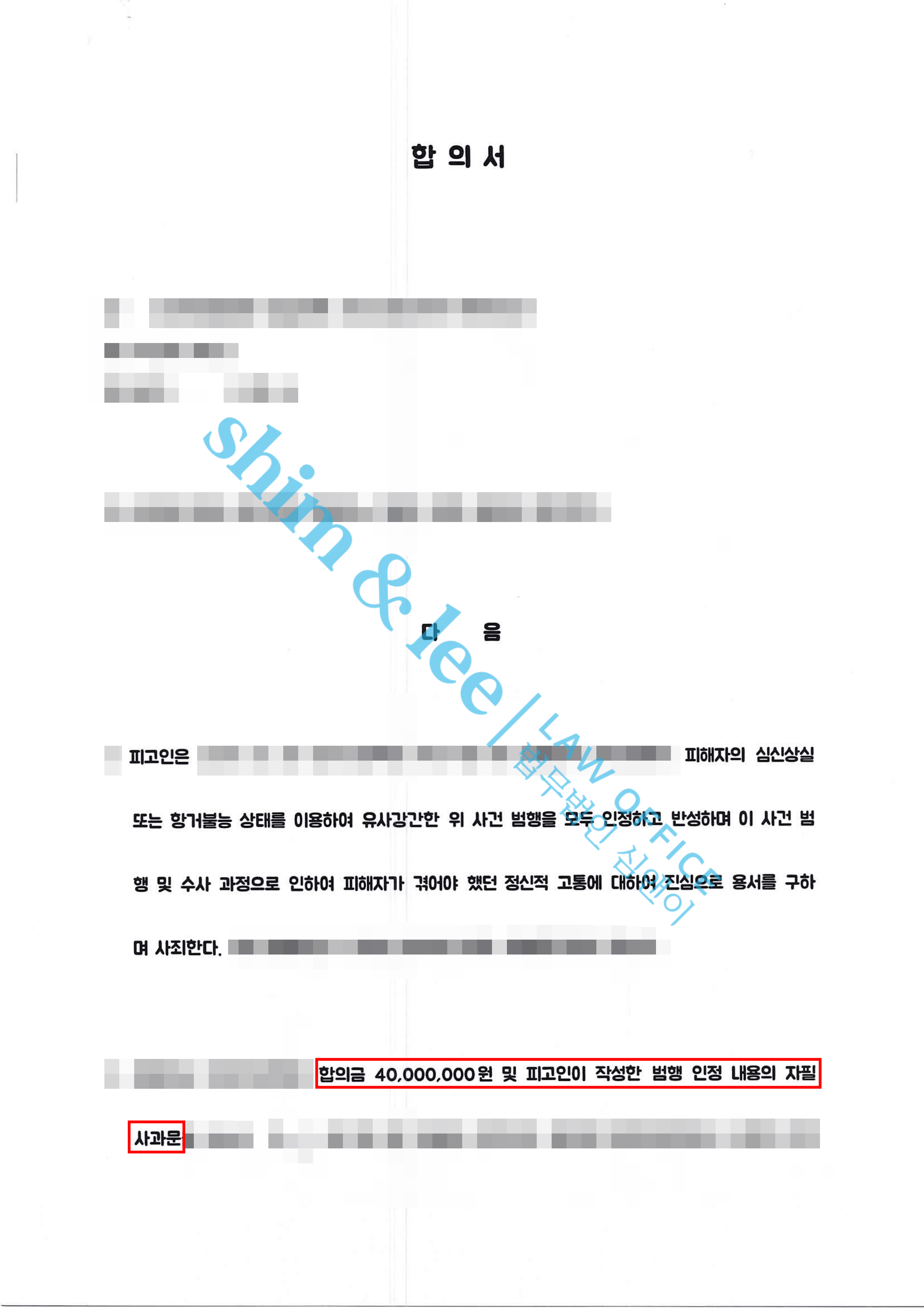 - 대표 변호사님은 피해자가 이 사건으로 더 이상 고통받는 일이 없도록 합의서에 비밀유지, 접근 및 보복금지, 통신제한, 소제기금지 조항을 추가하고, 이를 위반할 경우 가해자가 추가 금전을 지급하도록 하는 위약벌 조항까지 덧붙여 피해자에게 유리한 내용으로 합의서를 작성하였습니다.