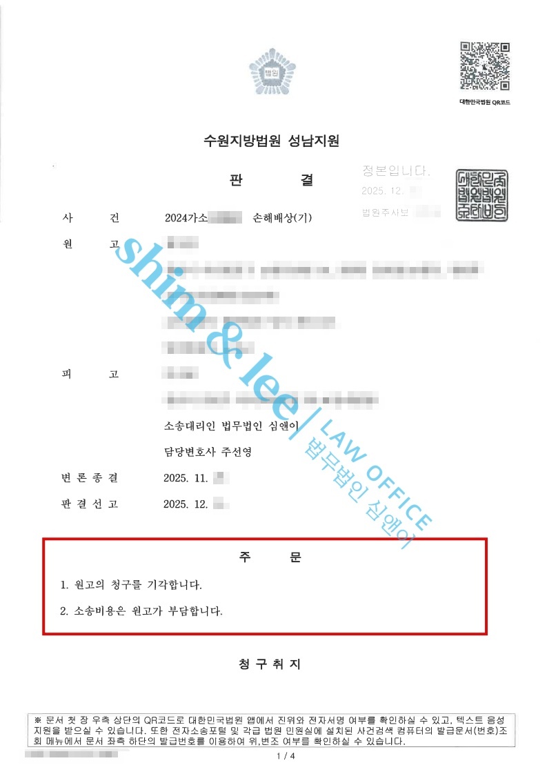 - 결과적으로 법원 재판부는 심앤이의 주장을 모두 받아들여 원고 패소 판결을 선고했습니다. 의뢰인인 피고가 허위사실 유포한 사실이 없다는 점과 원고가 제기한 소송이 성범죄 피해자를 상대로한 2차 가해성 소송이라는 점이 명확히 인정된 것입니다.