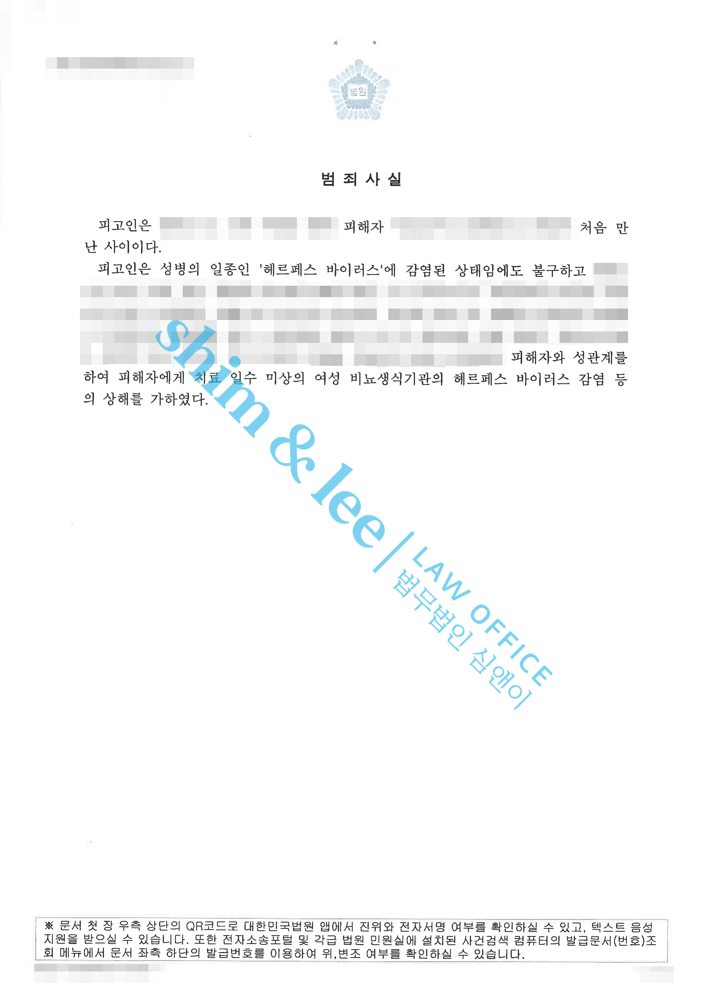 - 이후 의뢰인은 처음 느껴보는 음부 통증에 산부인과를 찾았고, 성병 검사를 한 결과 헤르페스 2형에 감염되었다는 것을 알게 되었습니다. 의뢰인은 곧바로 가해자에게 연락하여 확진 사실을 알렸고, 가해자는 병원비를 지불하겠다며 마치 자신 때문에 옮았을 것이라는 태도를 보였습니다.