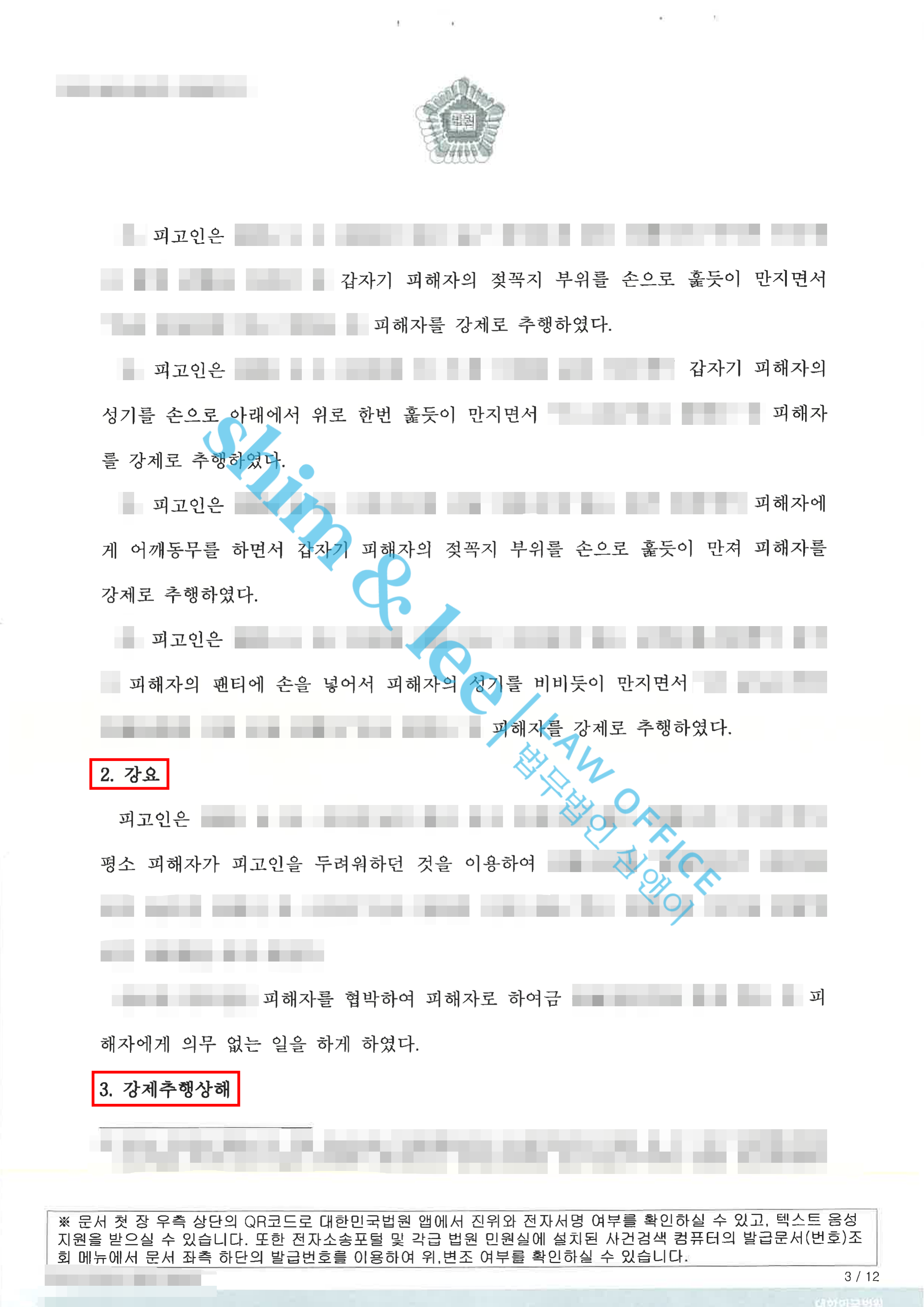형사고소직장 상사가 산책 중 갑자기 성관계를 요구하며 강제로 추행한 사례 2022.01.03합의금 2,000만 원 / 기소유예 -