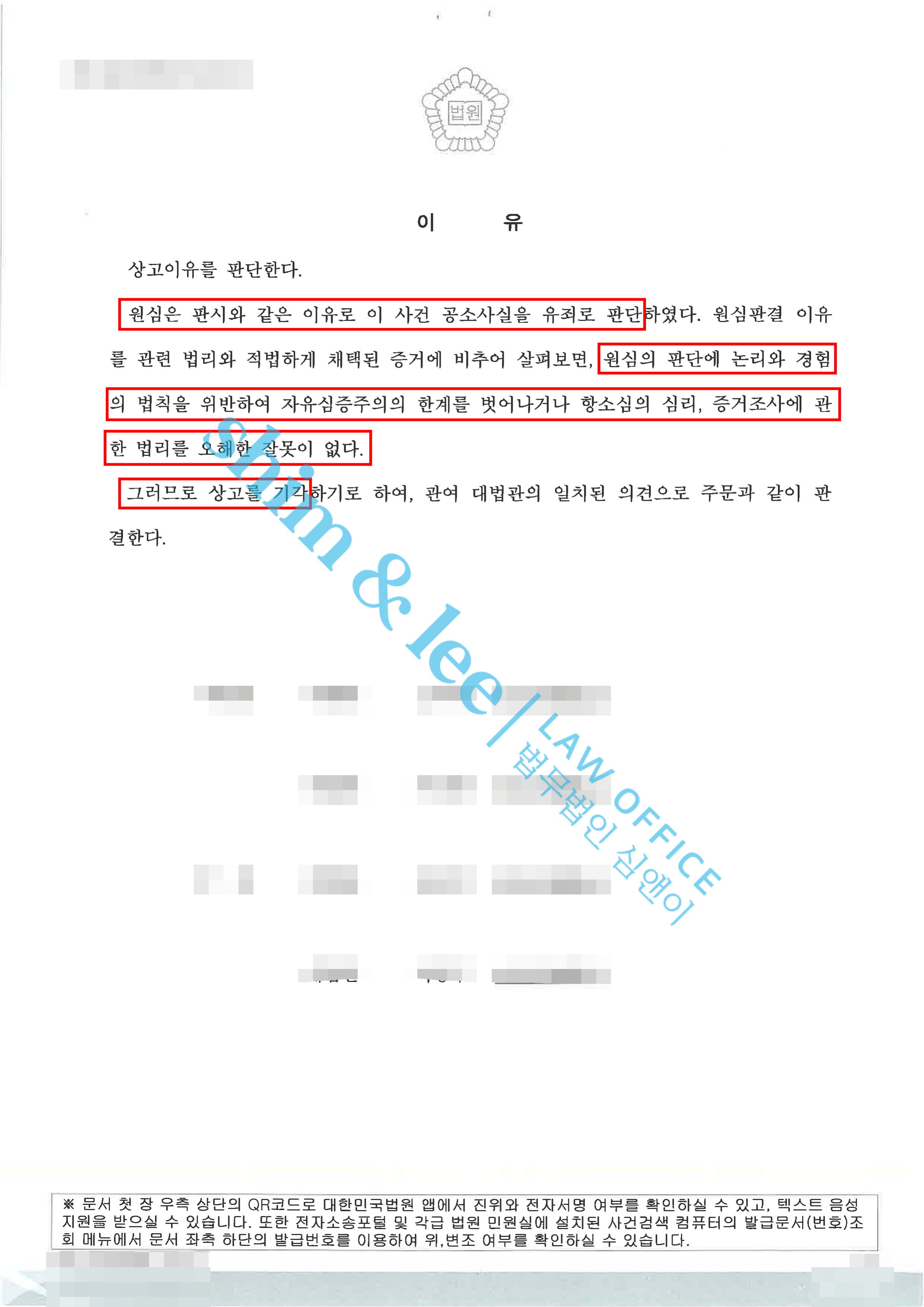 - 도저히 납득할 수 없는 판결에 억울함을 느낀 의뢰인은 항소심을 앞두고 심앤이를 찾아오셨고, 치열하게 다툰 끝에 항소심에서는 무죄를 유죄로 뒤집고, 가해자에게 징역 3년 6월, 성폭력 치료강의 40시간, 취업제한 5년이라는 엄중한 선고가 내려졌습니다.
