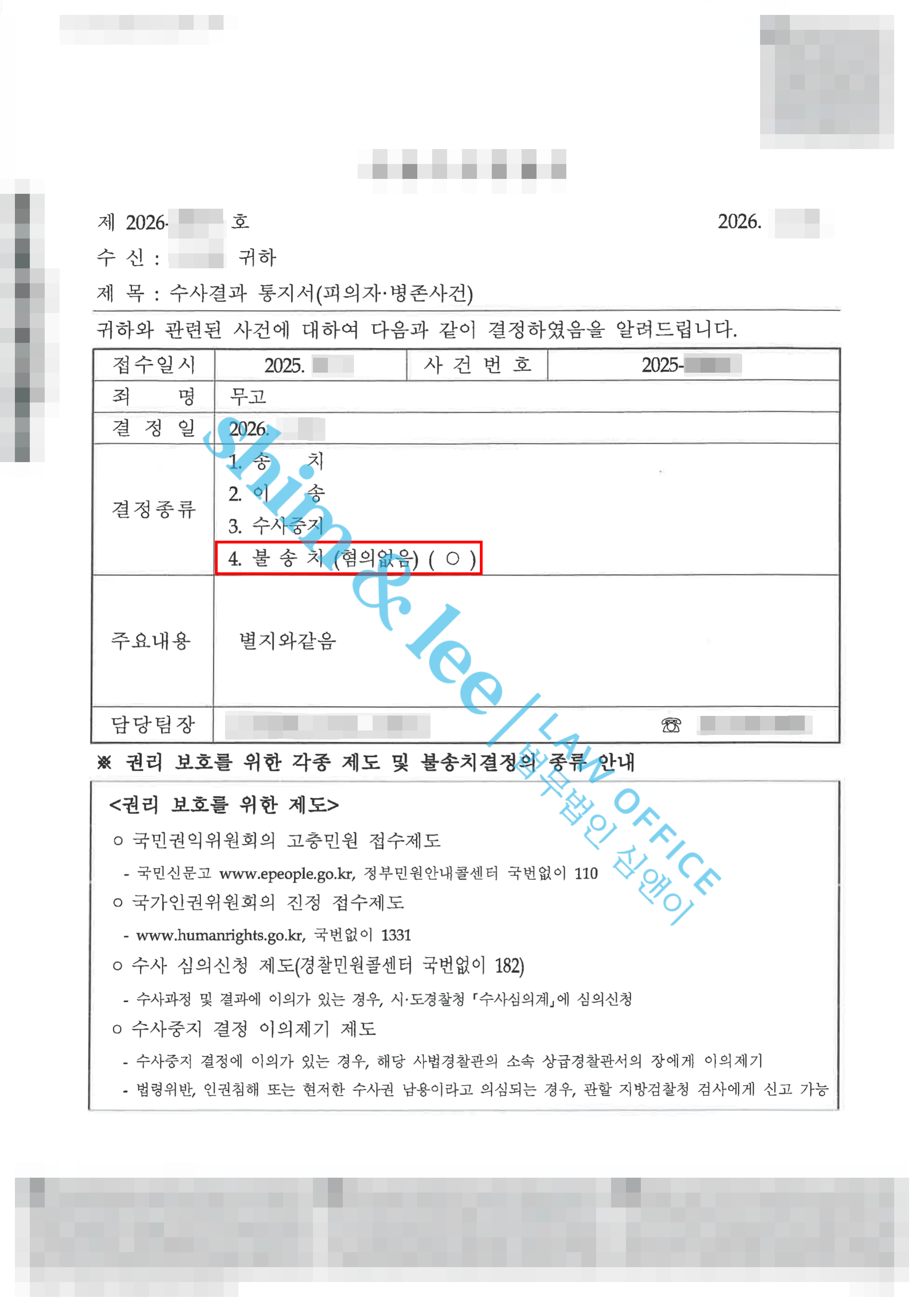 - 담당 수사관은 사건을 검토한 끝에, 의뢰인의 진술과 심앤이가 제출한 의견을 받아들여 무고 혐의에 대해 불송치 결정을 내렸습니다.