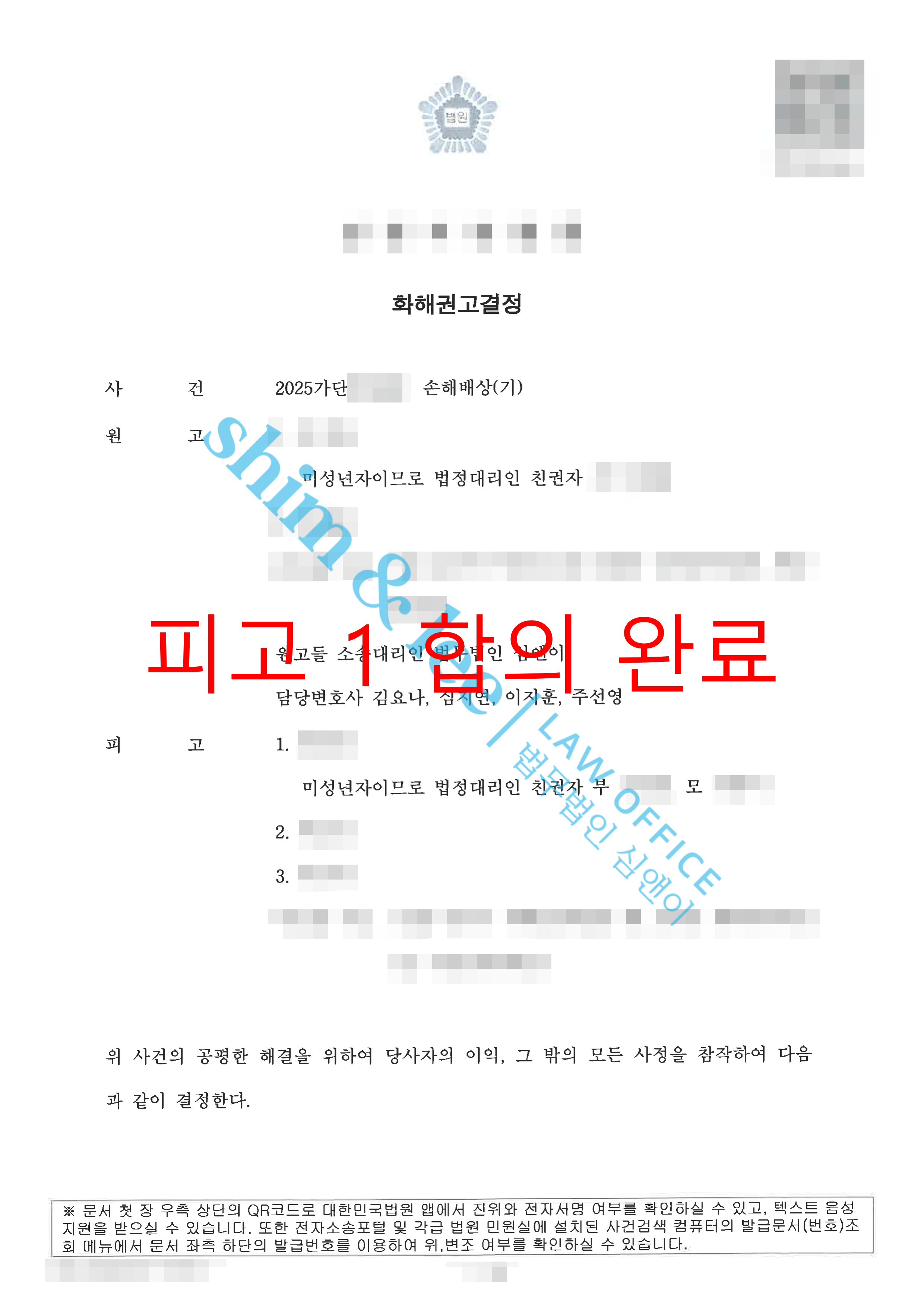 - 소장을 송달 받은 가해자들 중 1인은 진심으로 반성한다는 뜻을 전하며 1200만 원에 합의를 요청해왔습니다. 이에 합의를 전담으로 맡고 계시는 대표 변호사님은 형사재판이 함께 진행되고 있는 사건인 만큼 형사와 민사를 모두 포함하는 통합 합의가 이루어지기 위해서는 피해자가 납득할 수 있는 수준의 금액이 마련되어야 한다는 점을 분명히 하며 단호한 태도로 협상의 주도권을 잡아 합의를 진행하셨습니다.