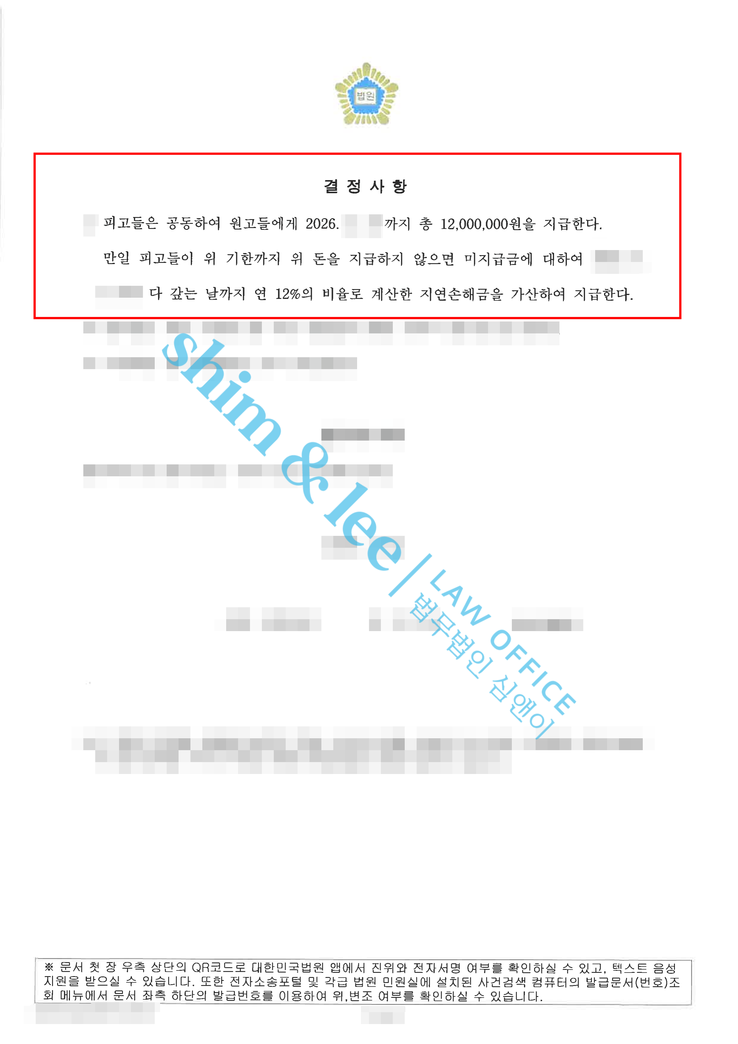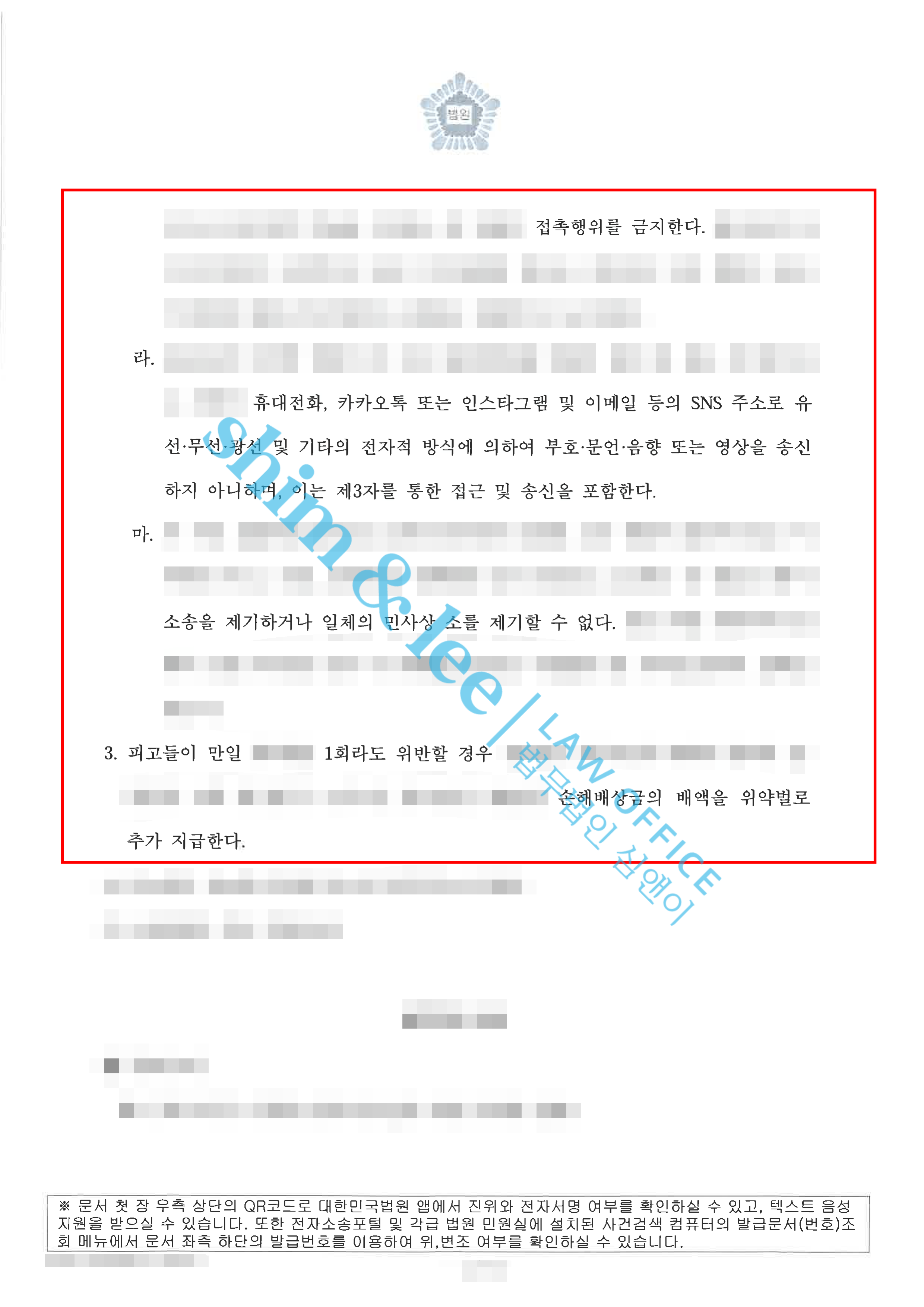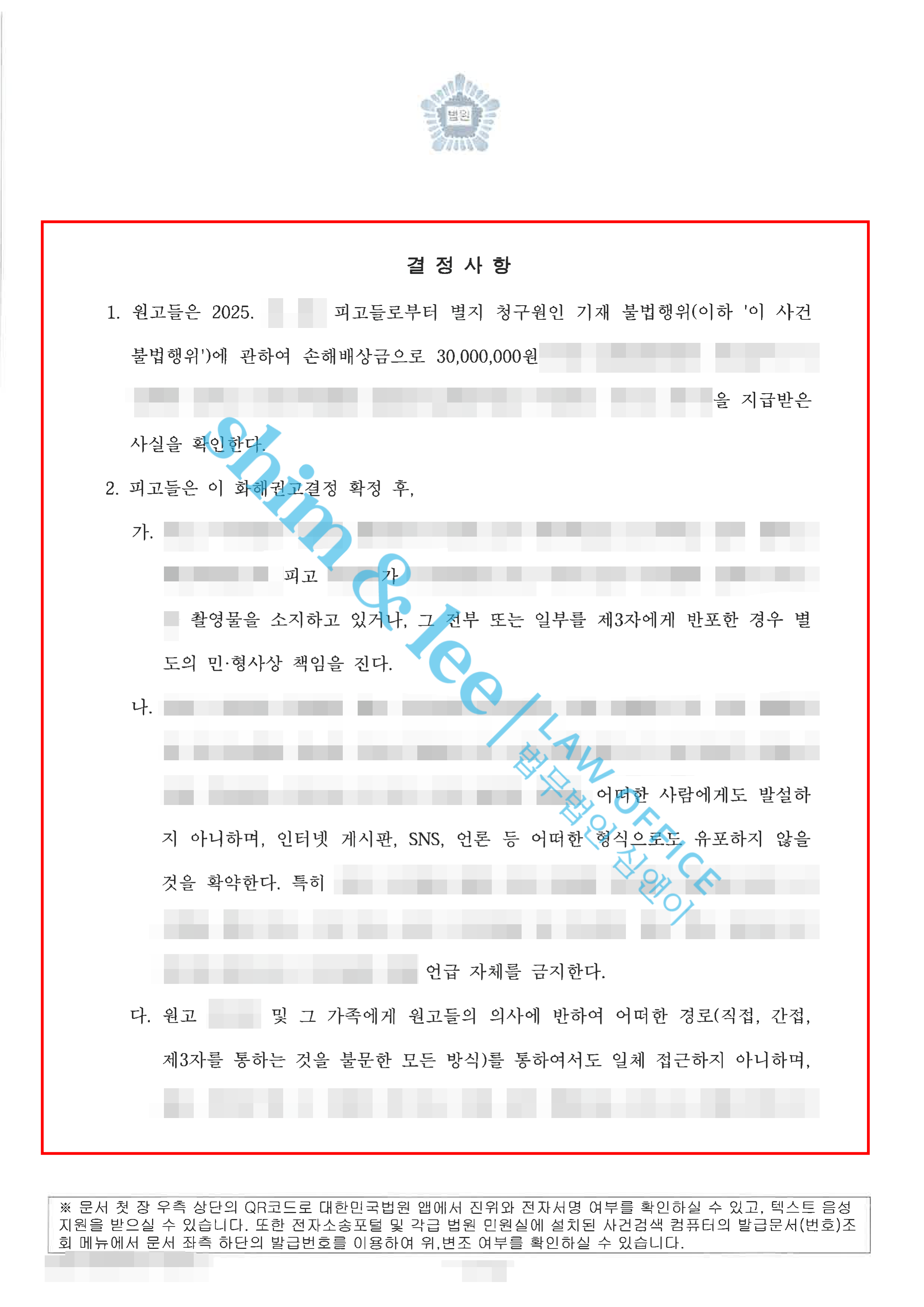 - 심앤이의 적극적인 조력 끝에 합의를 진행한 가해자는 처음 제안한 금액에서 약 3배 증액하여 3000만 원을 최종적으로 제안해오며 극적으로 합의가 성사되었습니다. 이후 재판부에 화해권고신청을 하여 재판부 역시 합의서 내용을 그대로 반영한 화해권고결정을 내려주었습니다. 특히, 화해권고결정문에는 민사 판결문에서는 반영되기 어려운 촬영물미소지 / 비밀유지 / 접근금지 / 통신제한 / 보복금지 / 소제기금지 등 부가조항까지 포함되어 피해자의 안전까지 고려한 결정문을 받을 수 있었습니다.