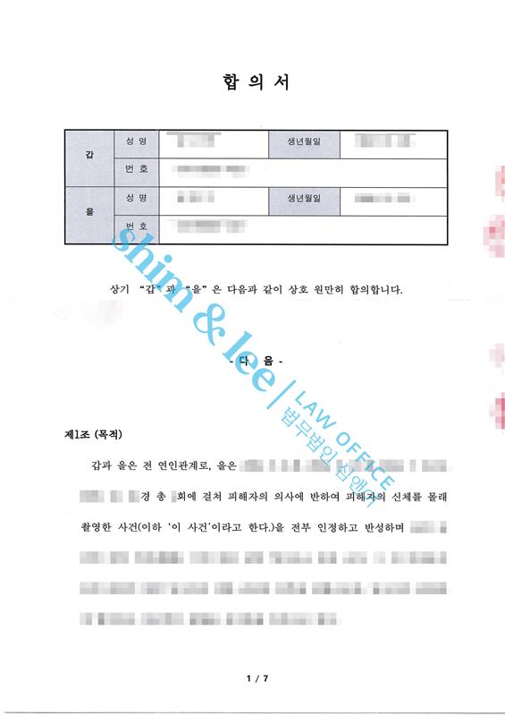 -단호한 대응에 합의가 결렬될 것을 우려한 가해자는 고소장 접수를 미뤄 달라고 요청하며, 합의금을 8,500만 원까지 크게 증액했습니다. 대표 변호사님은 금전적인 보상만으로 끝내지 않고, 촬영물 미소지, 비밀유지, 접근금지, 통신제한 등 의뢰인을 보호하기 위한 조항을 합의서에 모두 포함시켜 합의를 이끌어냈습니다.