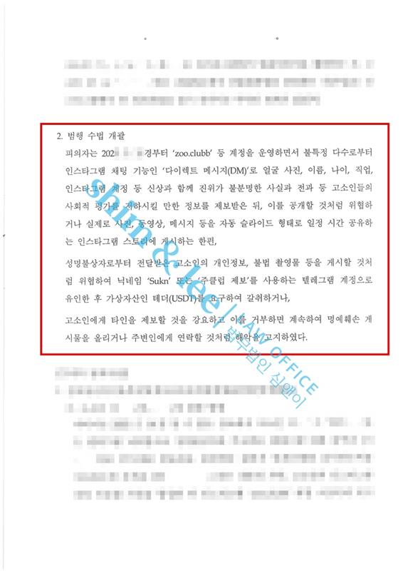 두 번째로는 문제된 부부은 ➁협박 및 갈취 행위였습니다. 주클럽은 ‘질문에 답하지 않으면 인정한 걸로 알고 사진 뿌리겠다.’, ‘차단해도 사진 뿌린다.’, ‘쇼츠를 만들어 전국민이 보게 하겠다.’는 식으로, 단순한 감정표현이나 욕설이 아니라 폭로를 수단으로 사람을 겁주고 통제하는 방식으로 범행이 상당히 심각하다고 강조했습니다. 더불어, 수사관이 단순 명예훼손이나 협박으로 사건을 축소하지 않도록, 피해자의 평판 훼손을 이용해 경제적 이익까지 얻는 최종적으로 금전과 연결된 심각한 범죄로 인식될 수 있도록 전달했습니다.