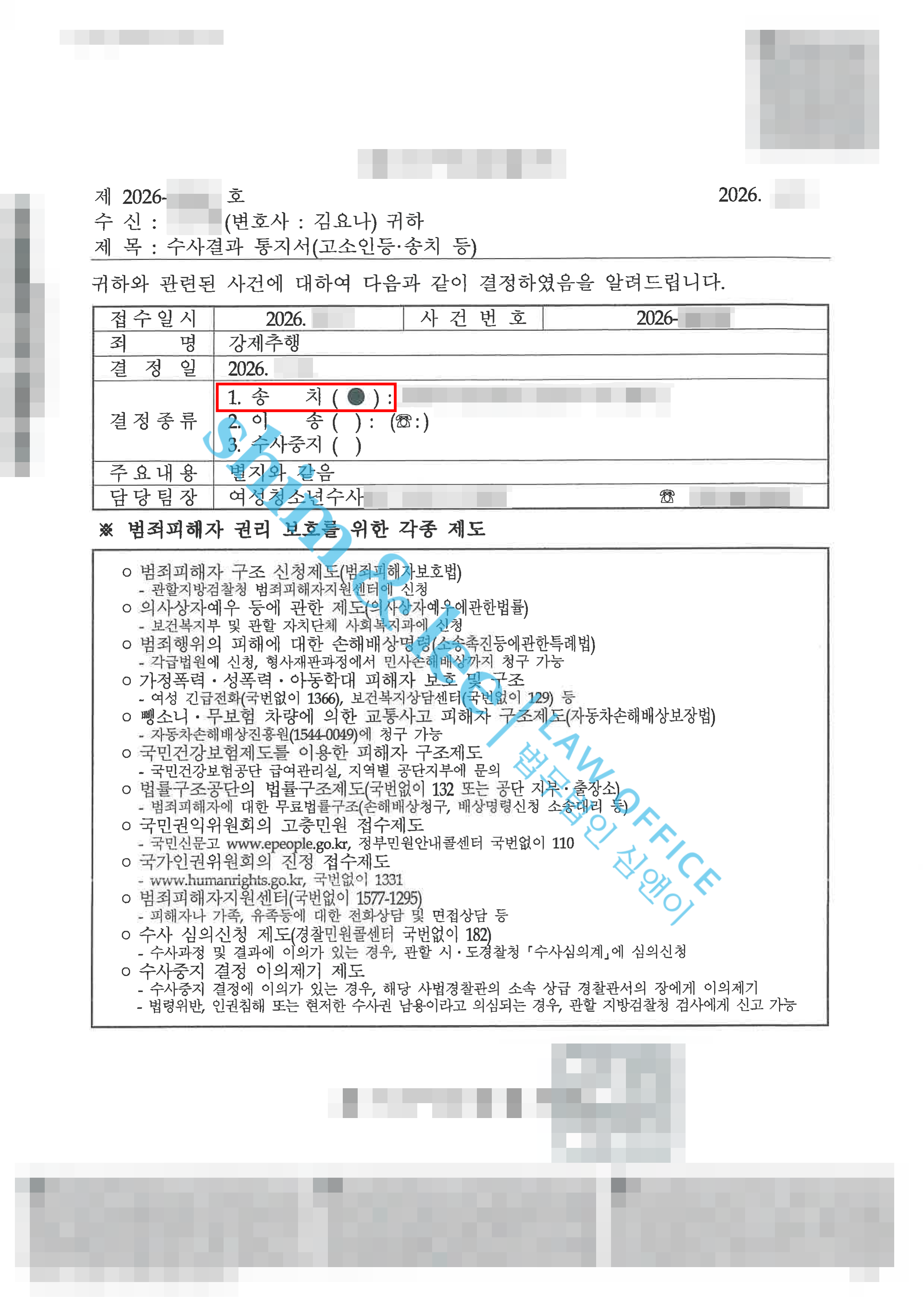 형사고소이웃주민에게 준강제추행 피해, 불송치 후 보완수사에서 송치로 바꿔낸 사건 2026.03.06불송치의견 변경