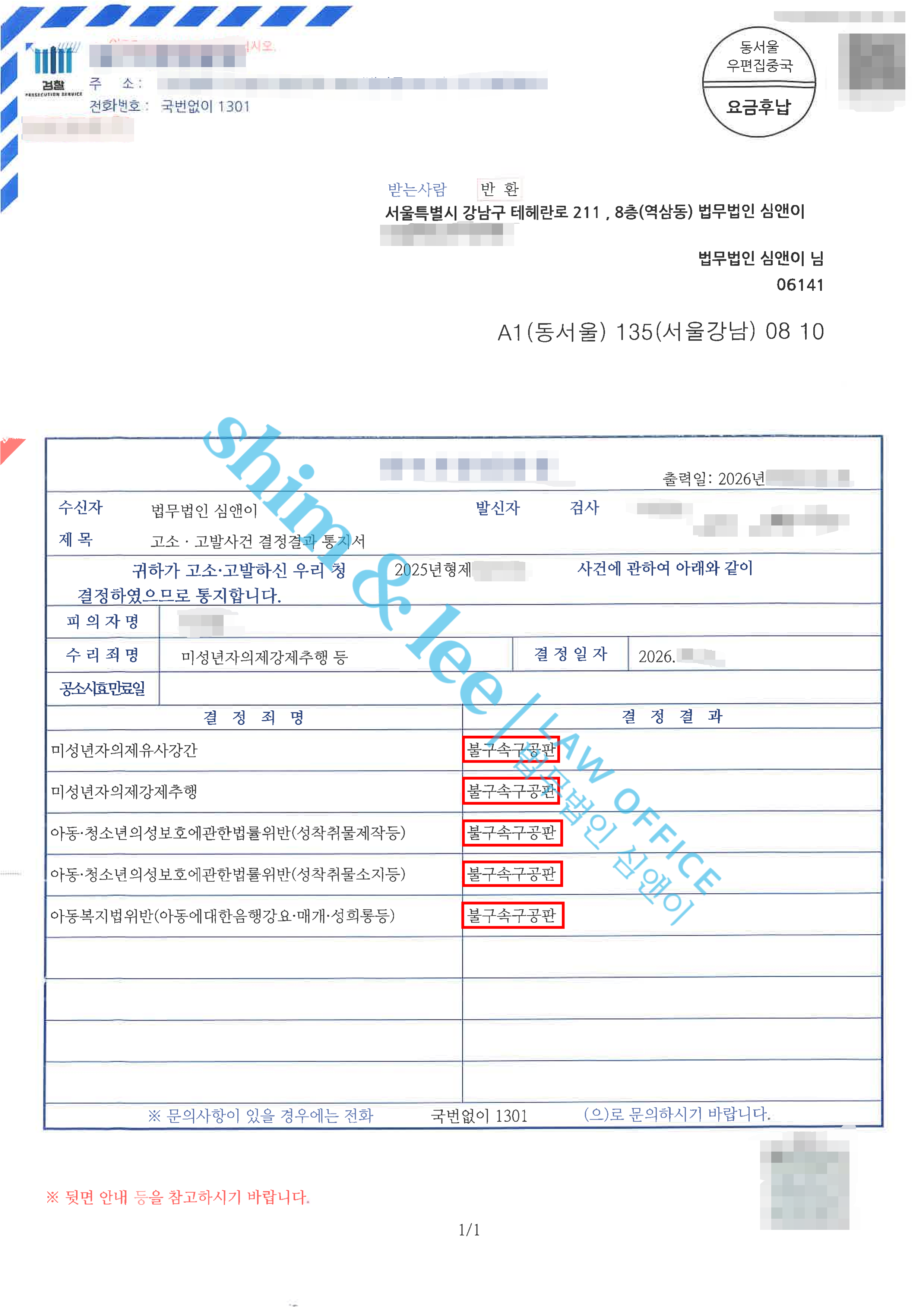 결과 고소장에 기재했던 미성년자의제유사강간, 미성년자의제강제추행, 아청법위반(성착취물제작), 아청법위반(성착취물소지), 아동복지법위반 혐의가 모두 인정되어 기소 처분이 내려졌습니다.