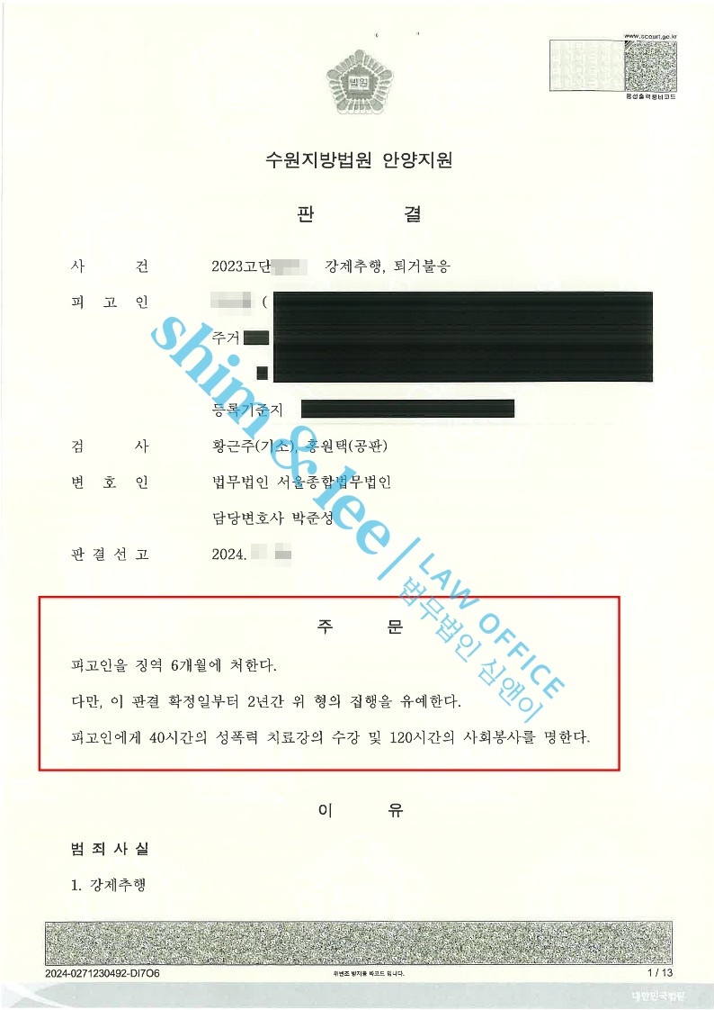 성폭력 치료강의 40시간 / 합의금 1,200만 원 -