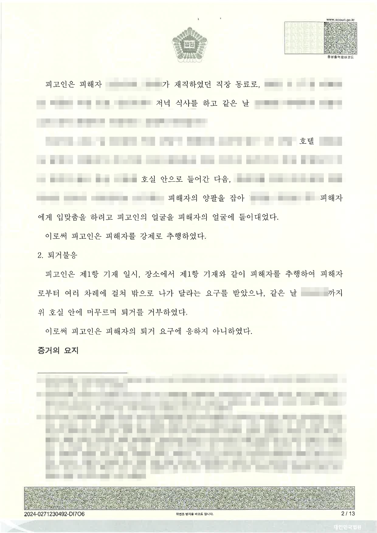 - 가해자는 의뢰인과 오래된 직장 동료이자 의뢰인이 결혼하여 가정이 있다는 사실을 알면서도 의뢰인이 취해 보여 안전하게 데려다 준다는 핑계로 호텔까지 동행하였고, 방 앞에서 인사하려는 의뢰인의 말을 무시하고 막무가내로 방 안까지 들어와 양팔을 잡아당겨 의뢰인을 침대에 앉히고 억지로 스킨십을 시도하려고 하였습니다