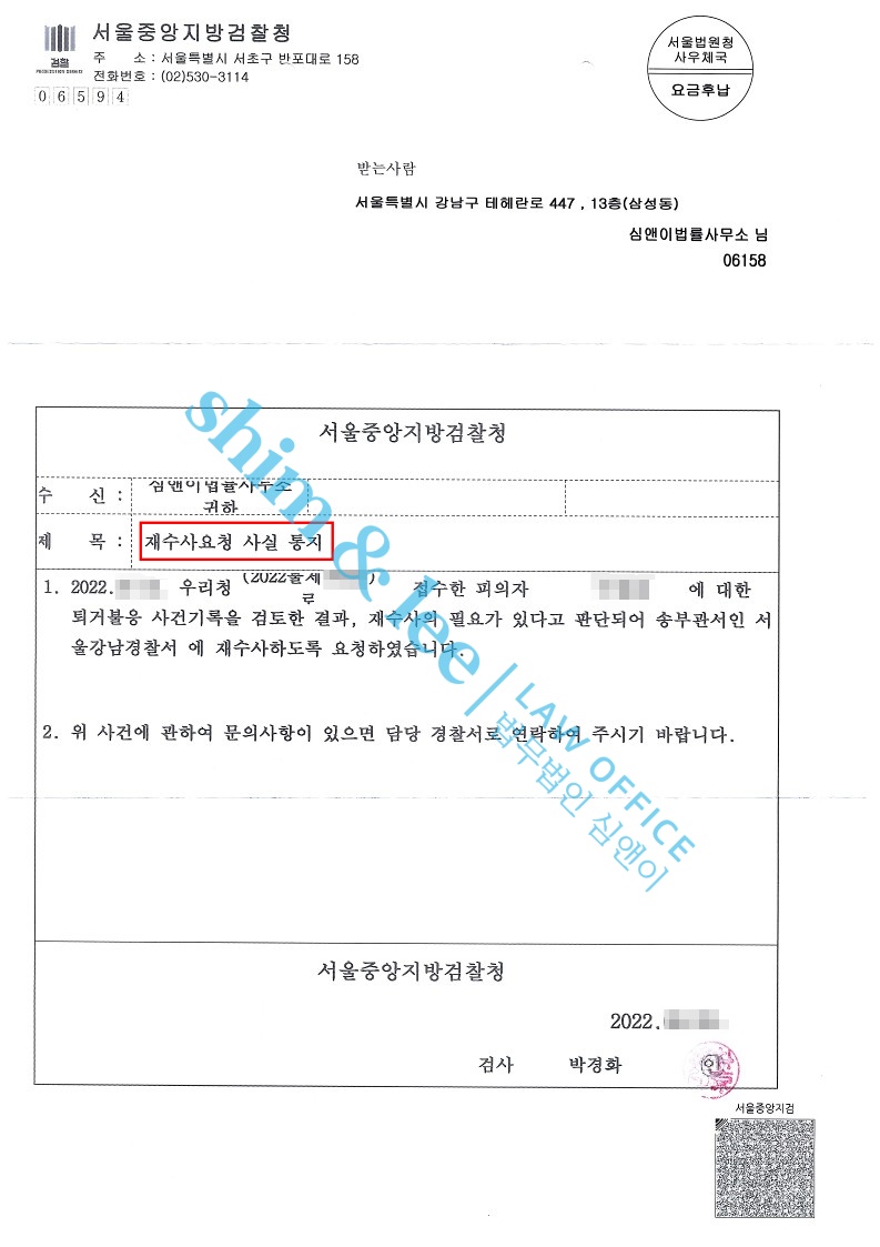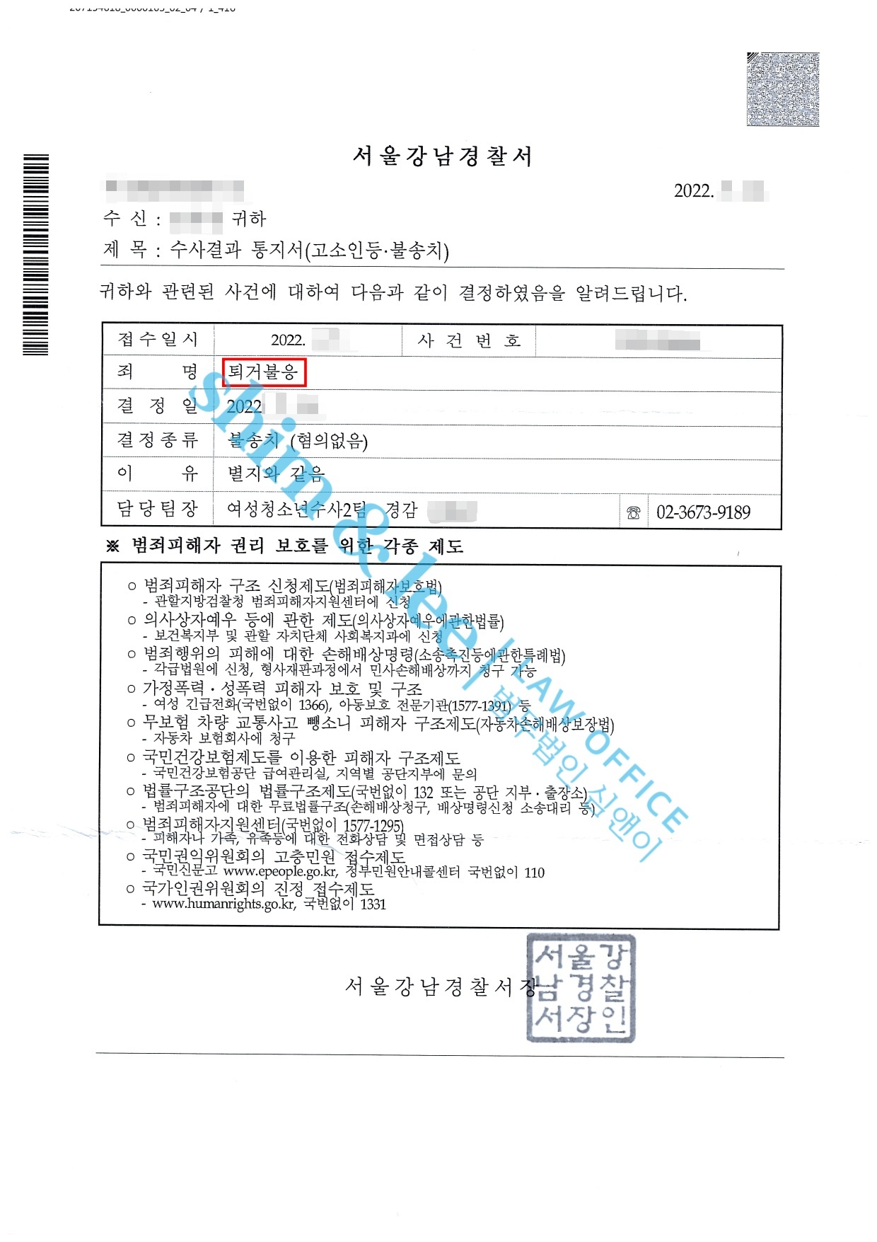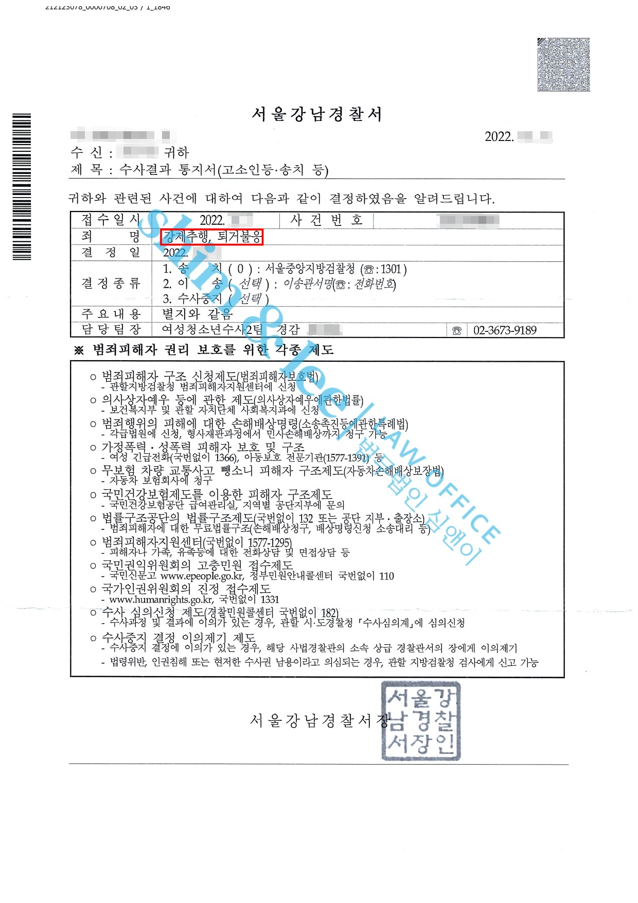 2. 또한, 증거불충분으로 불송치될 뻔한 퇴거불응 건에 대하여도 피해자가 수차례 퇴거를 요청했다는 점을 근거로 변호사 의견서를 작성하여 지속적으로 모든 혐의를 인정시키기 위한 노력을 이어나갔습니다. 검사실과 지속적으로 소통하며 재수사가 필요하다는 점을 어필하였고, 마침내 검찰은 경찰의 수사가 미진하고 관련 법리를 잘못 해석했다는 이유로 불송치 결정에 대한 재수사를 요청하였습니다.