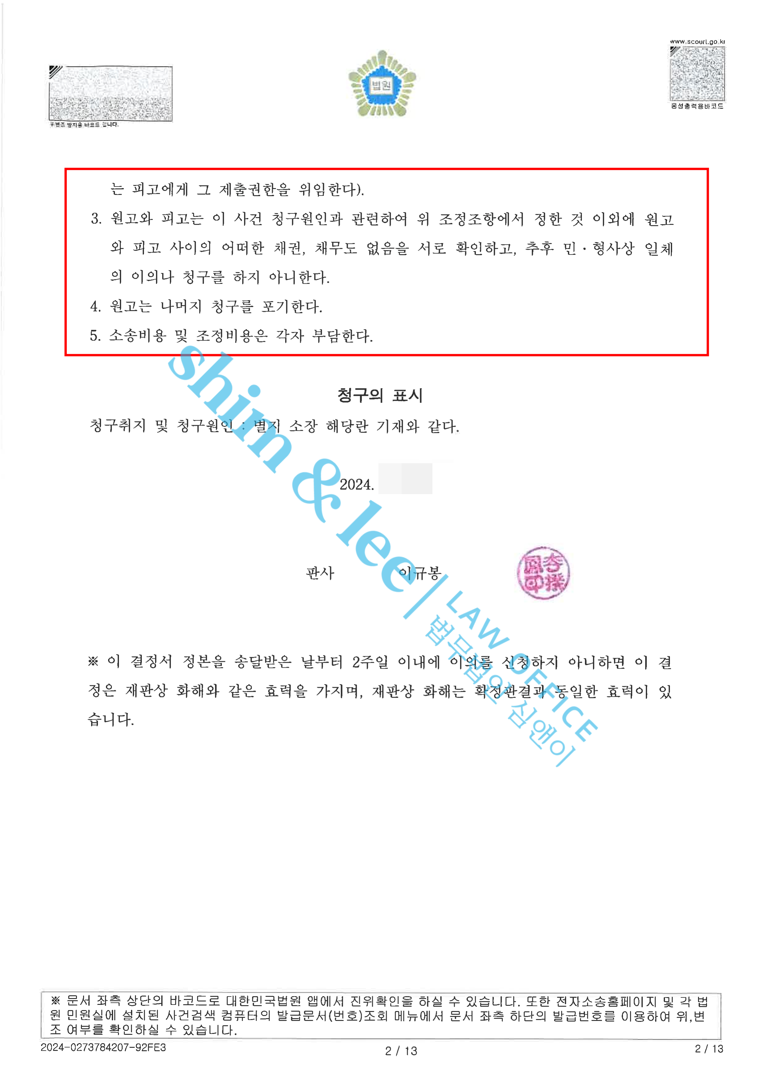 - 오랜시간 고통 받으셨던 의뢰인님을 위해 심앤이는 조정결정문에는 적혀있지 않은 세세한 항목까지 합의서에 모두 넣어 의뢰인님께서 만족해 하시는 내용과 금액으로 합의까지 잘 마무리하게 되었습니다.