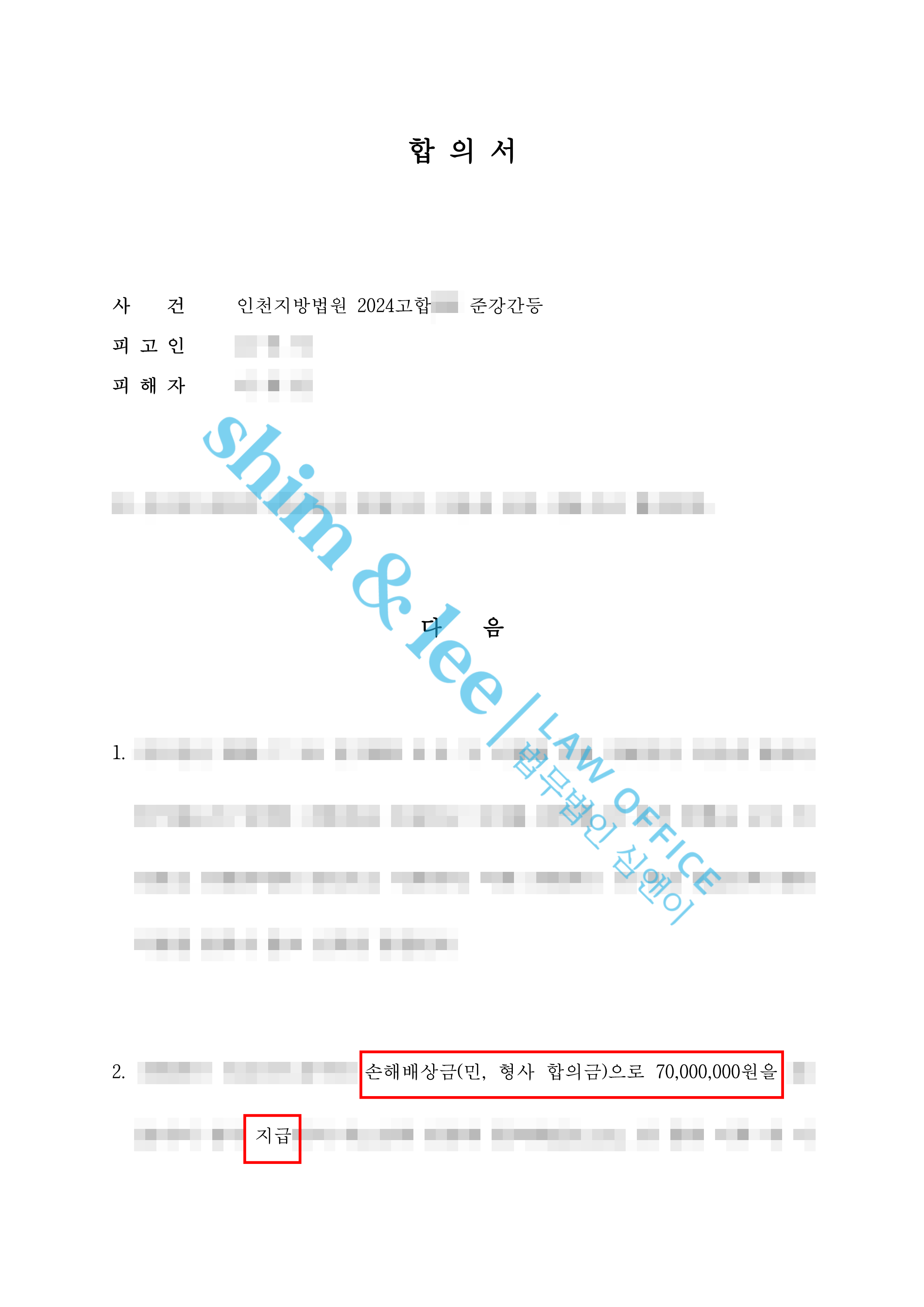- 또한 시간이 지난 사건으로 큰 기대를 하지 않았던 의뢰인님은 민사에서 예상보다 높은 7,000만 원이라는 강제조정 결정 금액에 대해 크게 기뻐하셨고 가해자측은 합의하고 싶다는 의사를 비추며 합의 요청을 하게 됩니다.