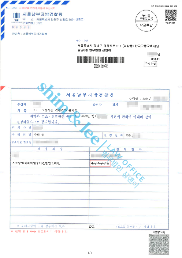 - 검찰로부터 스토킹범죄의처벌등에관한법률위반죄에 대해 불구속구공판 처분을 받아냈습니다.